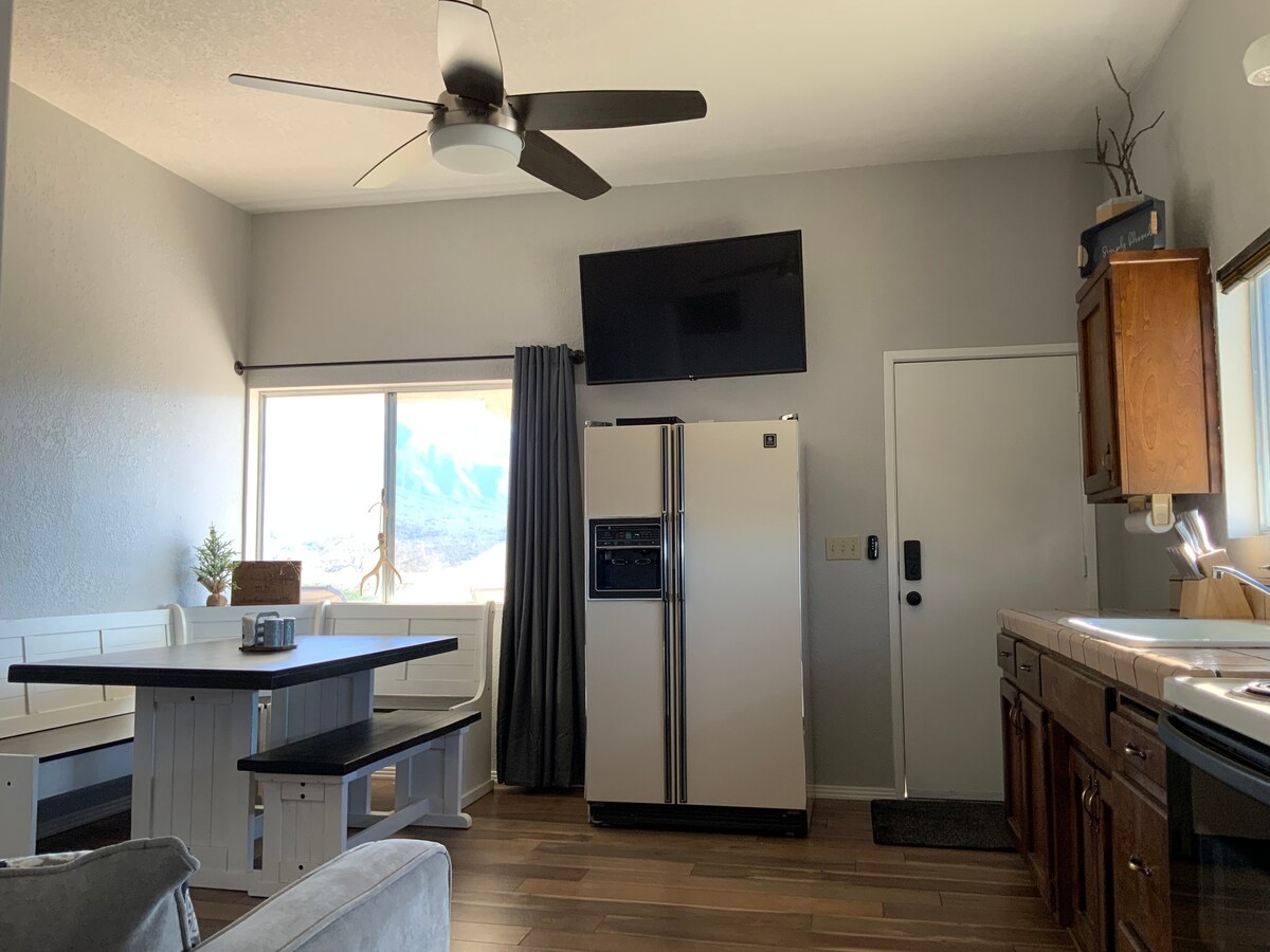 Tam təmir edilmiş 5-ci təkərdə ehtiyacınız olan hər şey var, üstəlik Təmizlik Haqqı Yoxdur! Sakit dağətəyi məhəllədə təpəlikdə yerləşən kiçik vadimizə və dağlarımıza gözəl mənzərə açılır. Burada yemək bişirmək üçün əsas ləvazimatları olan tam mətbəx, təmizlənmiş su, soyuducu/dondurucu, qəhvə maşını və Amazon Fire TV, WIFI, kiçik, lakin yaxşı təchiz olunmuş tam vanna otağı, təbii lateks 150-179 sm ölçülü çarpayı, kondisioner və istilik var. Aşağıda donuz və toyuqların otlamasını seyr edərkən qəhvə və təzə yumurtalardan zövq alın.