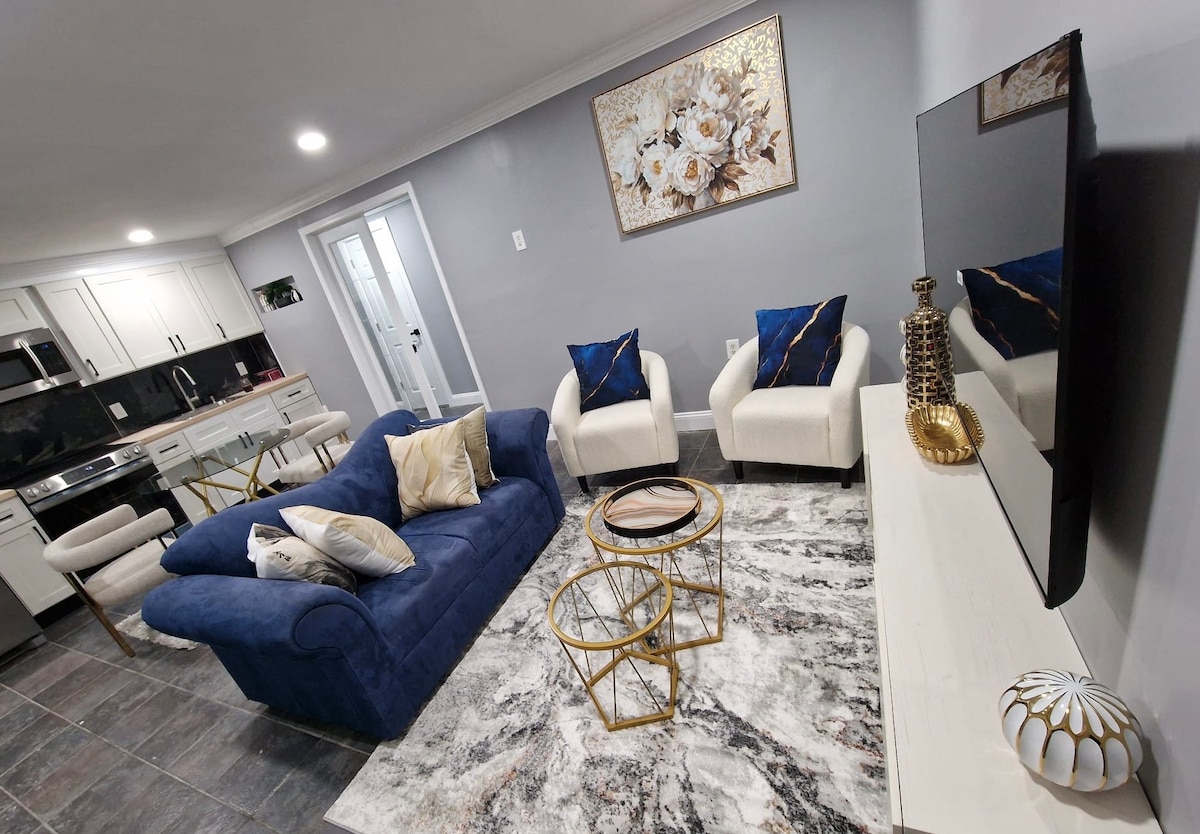 Newly renovated modern unit with a private entrance, kitchen, blue velvet seating, gold accents, and sleek finishes. Located in a quiet Nassau neighborhood. All utilities included. Ideal for professionals seeking comfort and style. Settle in, relax, and enjoy a serene, comfortable home base. Kick back and relax in this calm, stylish space.