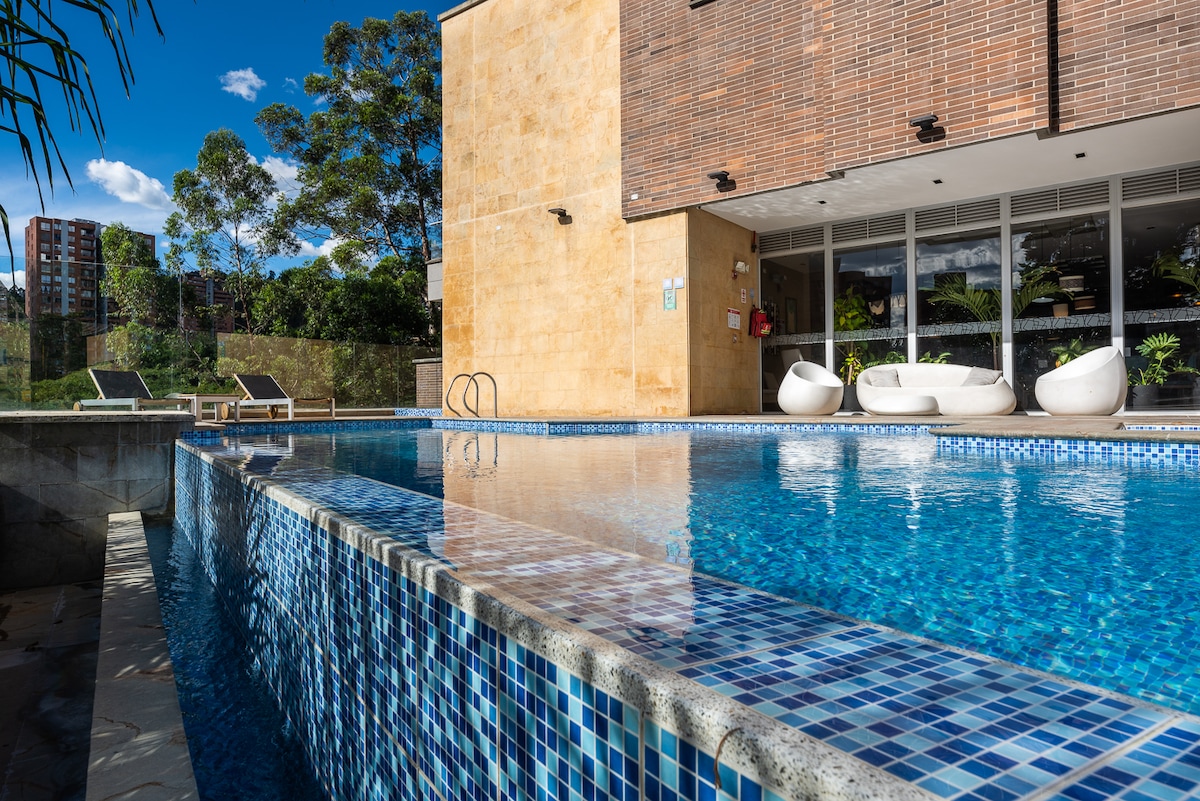 Bu unikal və sakit tətildə özünüzü asan hiss edin. Bu gözəl, müasir yeni 50 m² studiya sizin üçün hazırdır. Bankomatlar, Ərzaq mağazaları, Restoranlar və Kafelərin yaxınlığında. Provenza və Park Llerasda gecə şənliyinə piyada 10 dəqiqəlik məsafə. Kral çarpayısı, A/C, Netflix, 14-cü mərtəbədən valehedici mənzərə, binada idman zalı, parkinq yükü, təhlükəsizlik 24/7. * Cinsi turizmə qarşı sıfır dözümlülük. * Ev qaydalarımıza baxın. * Kolumbiya sakinisinizsə, IVA 19% əlavə ödəniş etməlisiniz.