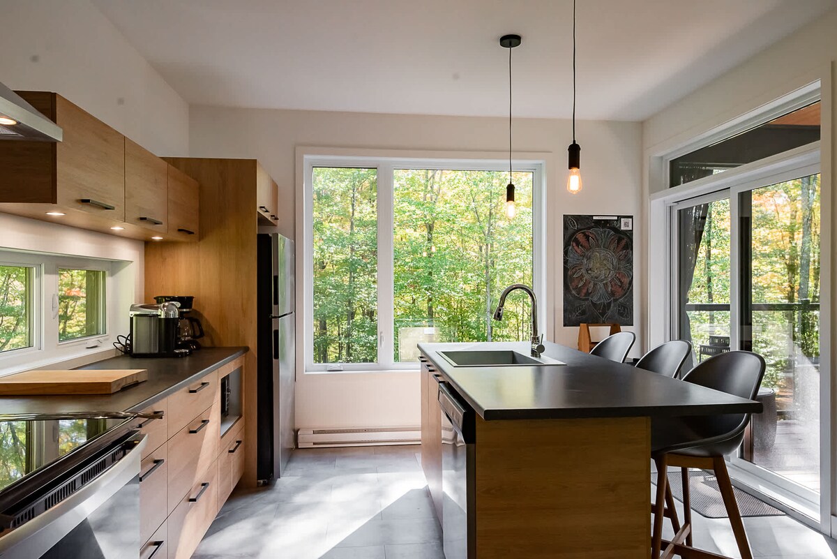 Monumental open concept, in the heart of nature. Access to trails directly behind the house. Wood stove, large modern bathroom, one bedroom + sofa bed. Another sofa bed in the living room. Ideal chalet for a couple with children or two couples. Wild birds, turkey, and deer lovers welcome! Wifi and EV charger included. Dogs Welcome! CITQ : #308038