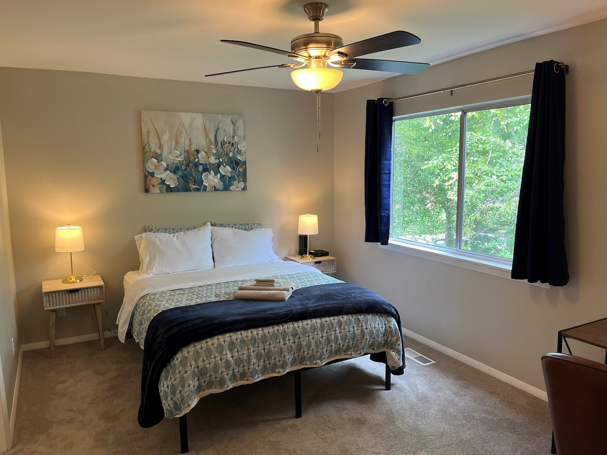 Evimizin aşağı mərtəbəsində ayrıca süitamızda qonaqlayın! UNC-yə cəmi 9 dəqiqəlik məsafədə əla mövqeyimiz var və I-40-a asanlıqla RDU və hava limanına asan giriş əldə edirik. Xüsusi bir iş stansiyası ilə ethernet çəngəl-bıçaq və mesh Wi-Fi ilə yüksək sürətli internet təmin edirik. Böyük mənzil ekranlı televizora ən azı 3 axın xidməti və Apple TV tətbiqi vasitəsilə şəxsi rəqəmsal film kitabxanamız daxildir. Keurig stansiyası qəhvə, çay və səhər əsasları ilə tam təmin olunub!