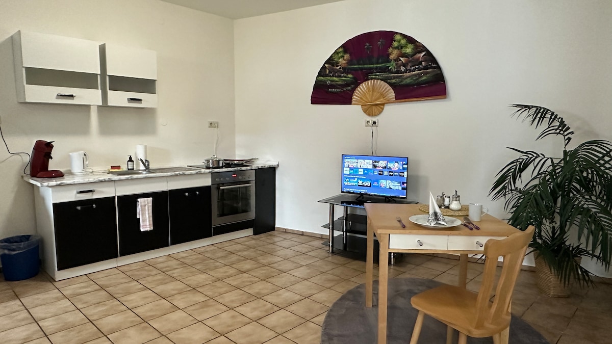Giriş açar seyfi vasitəsilə mümkündür. Parkinq yeri düz evin yanından keçir, Allgäu Hava Limanına 15 dəq. məsafədə. I.OG-dəki qonaq sahəsinə iki nəfərlik otaq - biri kiçik olmaqla iki nəfərlik otaq daxildir Kiçik yemək masası və duş otağı olan qonaq otağı. MƏTBƏX yoxdur, lakin soyuducu/dondurucu, mikrodalğalı soba, qəhvə maşını, çaydan və qablar (qabları qonaqlar tərəfindən qarqara etmək lazım deyil). Evdə səhər saat 11-dən axşam saat 8-ə qədər açıq olan kebiss var. 150 m məsafədə qəhvə və təzə bişmiş məhsullar əldə edə biləcəyiniz çörək zavodu var