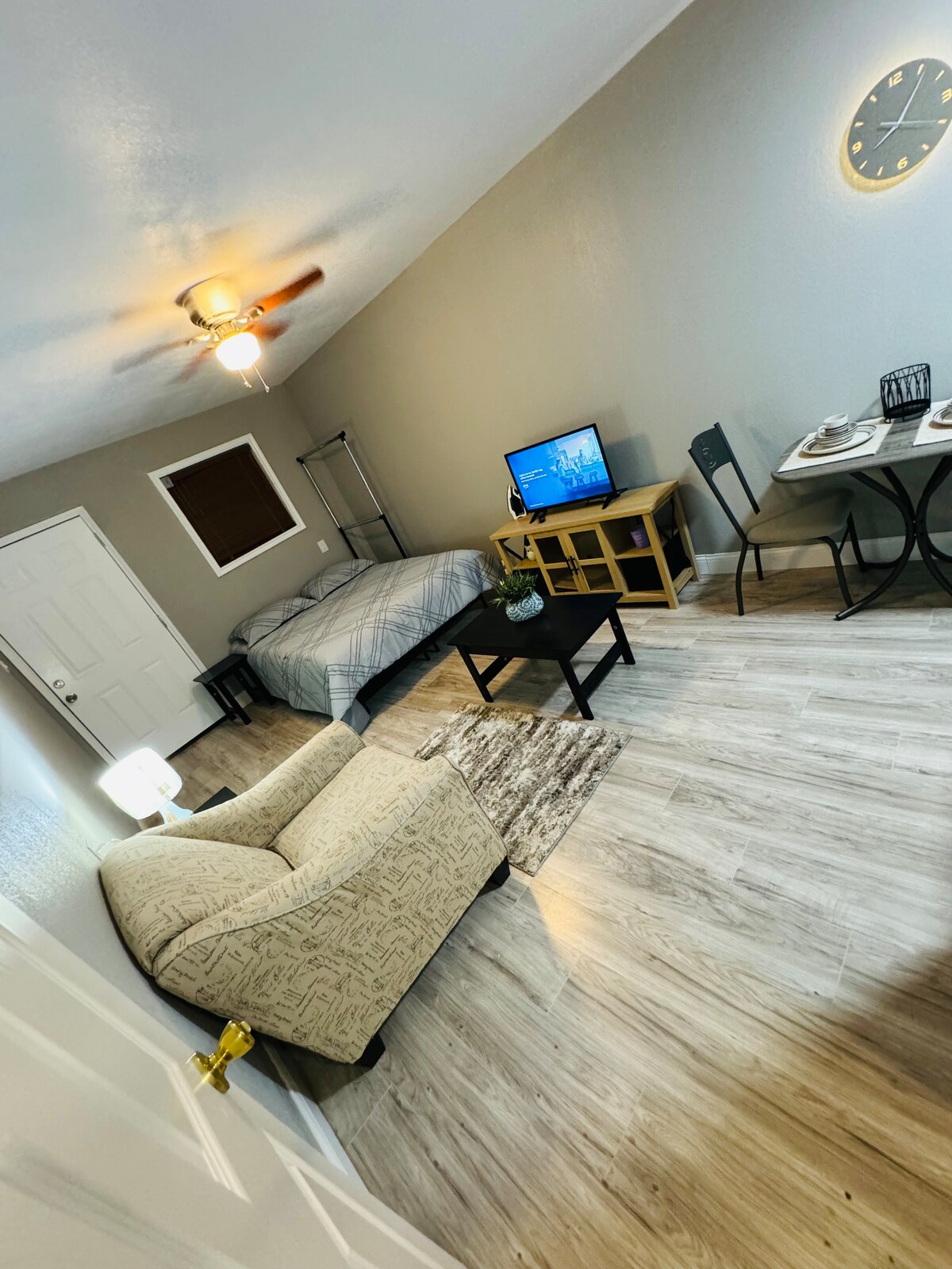 This sits on an acre property with another 5-room unit. The people on the property are mostly workers from out of town who need a quick stop, a week to find an apartment, or extending as needed. The bed size is Queen. 32" TV The door has a code lock to checkin at your convenience. Part of the road is unpaved and shown in a picture. Please consider this fact before booking. I cannot pave the road as it does not belong to me.