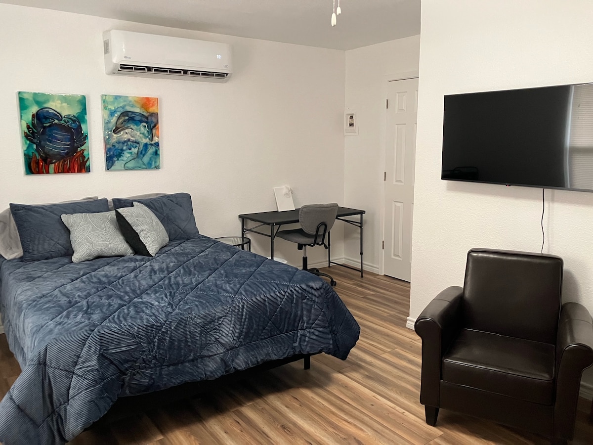 Welcome to your private West Texas retreat! This detached unit is designed for comfort, privacy, and convenience. Inside, you’ll find a plush queen-sized bed, in-unit washer and dryer, a compact kitchenette with cooktop and refrigerator, plus a smart TV and fiber internet for entertainment and productivity. Each unit is fully detached, meaning no shared walls and no noise from neighbors — just peace and quiet during your stay. Located close to dining, shopping, and major Odessa roadways.