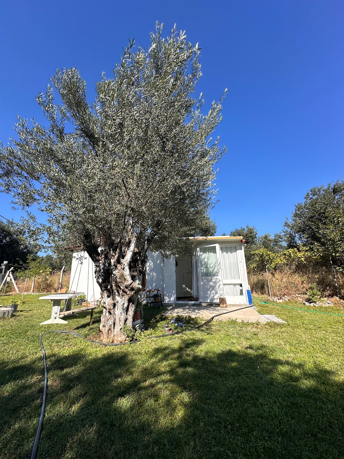 Relax with the whole family at this peaceful place to stay. Located on 1 acre of gorgeous olive trees garden, fully surrounded by high walls and fence, you’ll have plenty of space for sprawling out and enjoying the fresh mountain air in privacy. Pure natural veggies and a private pool. Two bedrooms 1 queen size bed, and 2 bunk beds with extra single beds. With two full bathrooms, there’s enough space to comfortably accommodate 5 people. Living room together with a full kitchen and AC.
