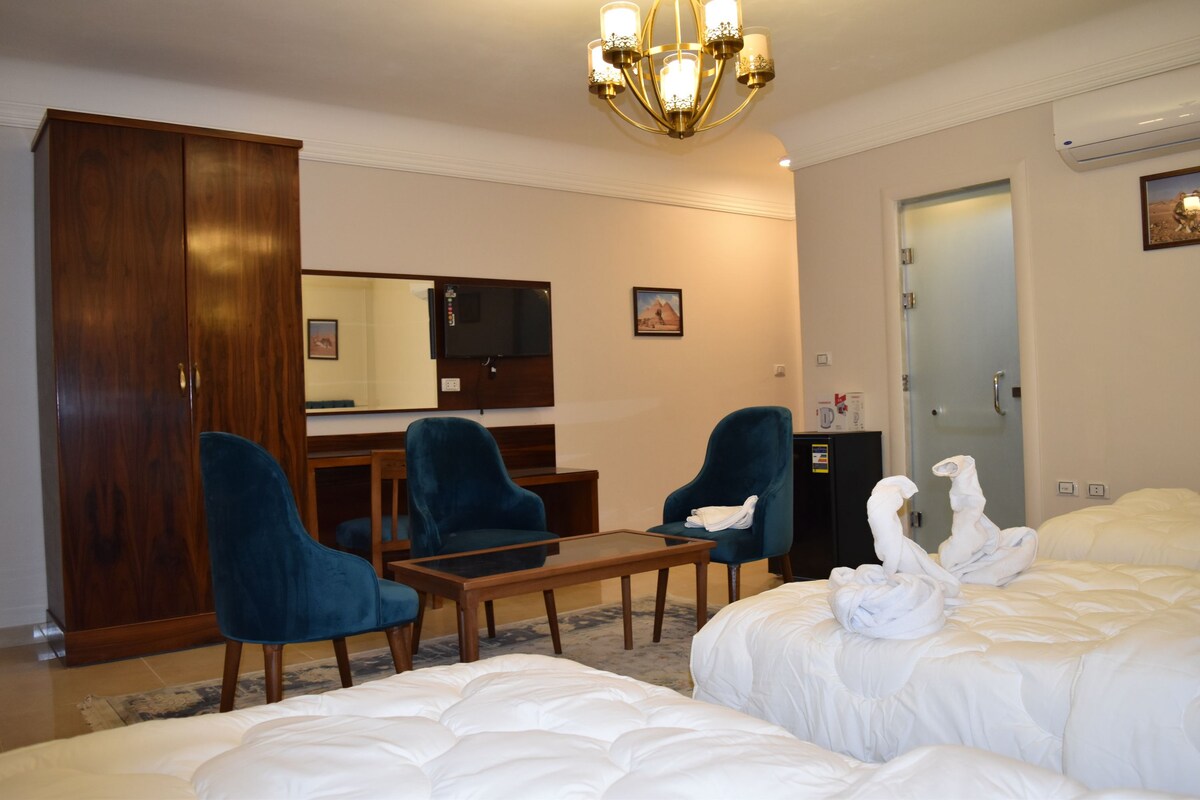 The room is about 30 square meters, everthing in the room is new and with high quality, and the general atmosphere in the room gives you a feeling of comfort, and the room has a private toilet and it's own heritage with pyramids view where ( 20 square meters), and there is free internet service in the room and a small refrigerator. There is also a great heritage with pyramids view where can eat food and drinks, enjoy the sun during looking at the pyramids
