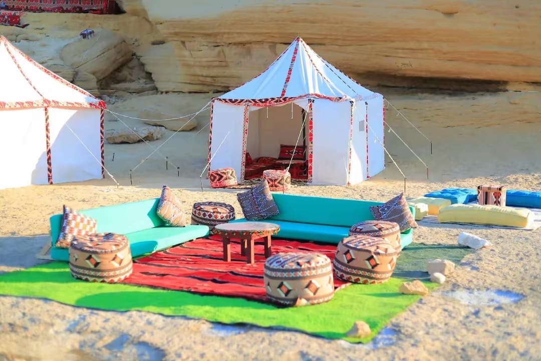 Enjoy the sounds of nature when you stay in this unique place. A unique camp in Marsa Matrouh inside the mountain and by the sea where you enjoy Bedouin culture (food, drinks & BBQ) Prices (including tea, water & Grill): - full day tent (20 hrs)2500 EGP (50$) - half day tent (10 hrs) 1250 EGP (25$) - Bedouin seatings from 1000 EGP (20$) Excluding Airbnb fees Tent max. capacity 5 people Available preparing food and whatever needed upon request