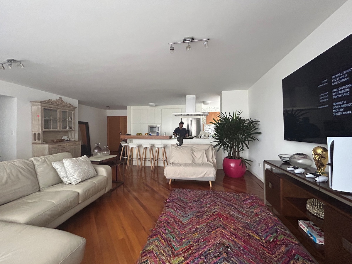Welcome to SkyLounge! Luxury 3BR apartment, La Carolina, sleeps 9. Prime Republica del Salvador location, safest & best in the city, steps from QuiCentro Mall, parks, dining & nightlife. Airport pickup, driver, car rental available. Tour operators with 13 years experience we arrange unforgettable excursions all across Ecuador. Enjoy spa treatments & private chef service right at home. Stylish comfort, unbeatable convenience—your perfect Quito home and stay awaits. Tri Lingual Hosts!