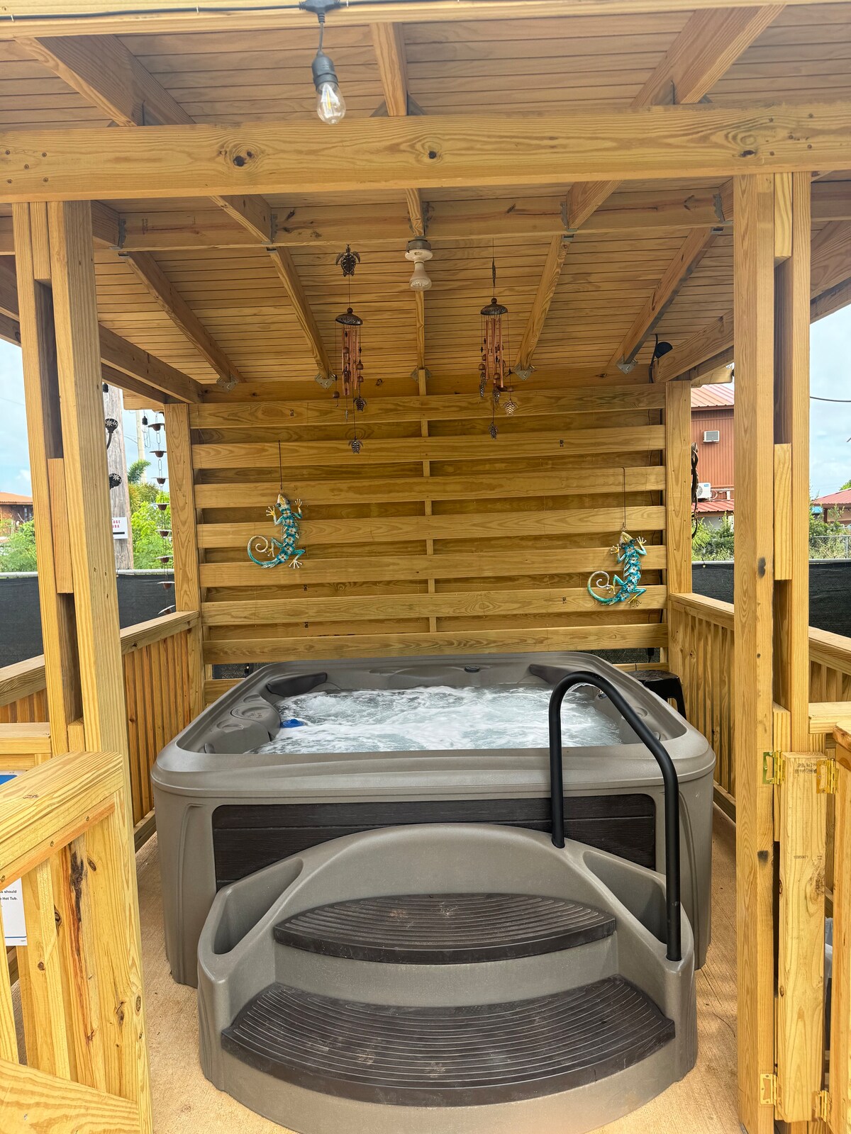 Peaceful retreat to unwind and reconnect with nature or your significant other. This thoughtfully designed container home features a dual-shower bathroom with skylight, full kitchen, and cozy indoor/outdoor layout. Enjoy a private jacuzzi, fire pit, panoramic deck, and BBQ ready patio perfect for sunsets and stargazing. Surrounded by nature, in a quiet area just minutes from top beaches and restaurants.