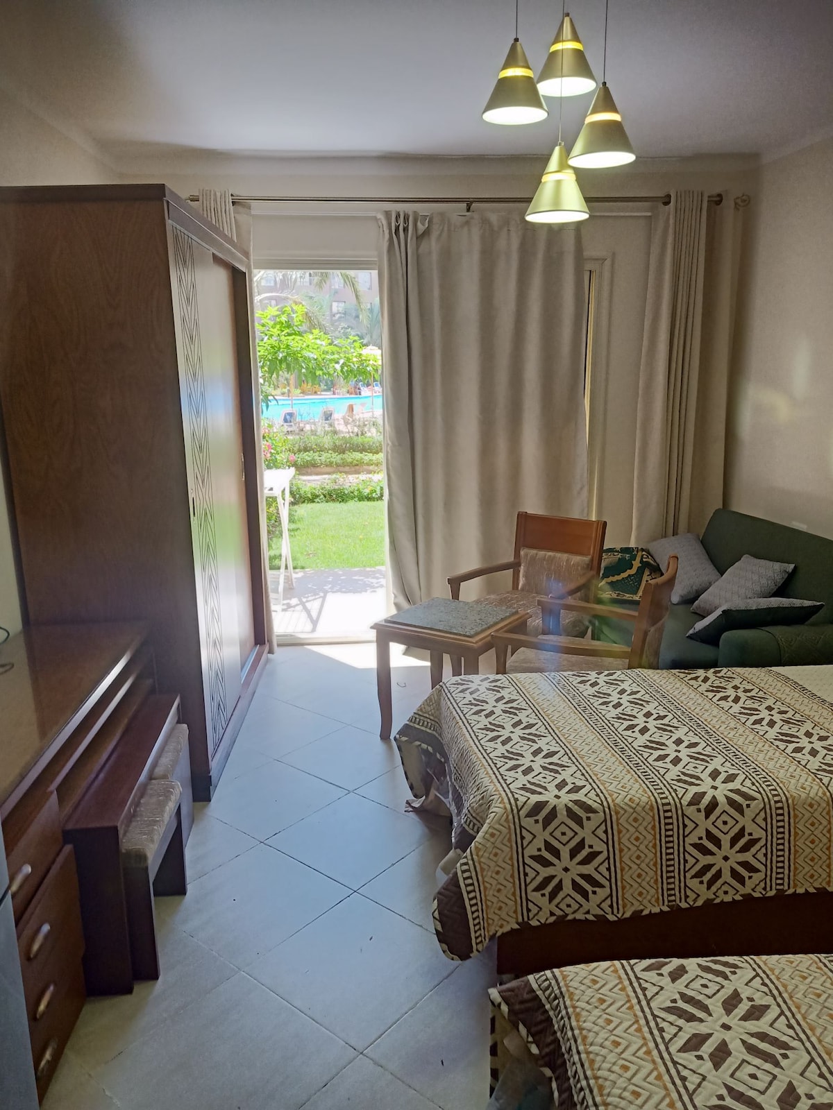 Two bedroom pool view challet at Green Leaves Village north coast k 75 , the village as all facilities ie different pools, day and night activities, aqua park, white sand beach, 2 supermarkets, clinic, pizza Sh.,bicycle / scooters / golf cars shop, different cafes on the beach same as inside the central area. The challet is almost a brand new. 1 min to centeral area by walking and 5 mins to the sea by walking too. Challet is bahary means that you will hardly need the AC even in the morning :)