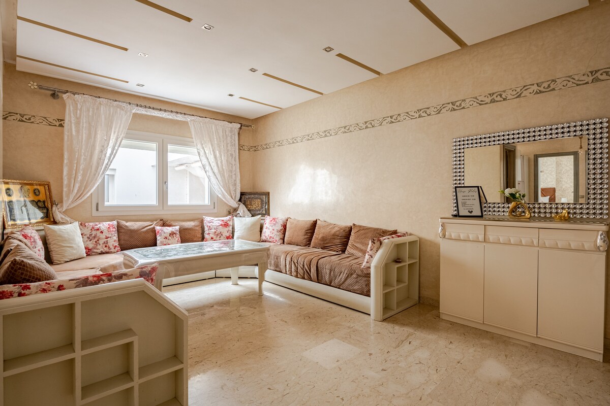 Oubliez vos soucis dans ce joli logement dans R+2 proche de toutes commodités ( commerces, hamam, four exterieur...) et à 5 min de la plage. porte séparée des étages. Il se compose d'un grand salon, d'un séjour, d'une grande chambre, d'une cuisine américaine, d'une belle salle de bain à l'italienne et d'une grande cour en pleine air. Bien ensoleillée, quartier sécurisé avec un concierge, place de parking gratuite. Soyez les bienvenus!