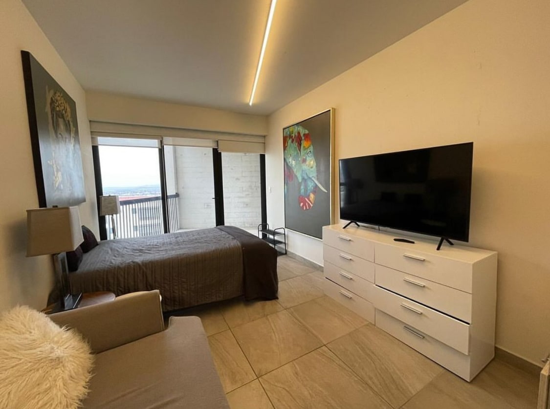 El departamento es completamente amueblado y está ubicado a solo 15 minutos del centro en carro y 20 minutos del aeropuerto, un espacio de estilo minimalista que te permite disfrutar de una hermosa vista a toda la ciudad, ideal para 4 personas cuenta con dos baños completos, 1 cama king size y 2 indivuduales, el edificio donde se ubica es pet friendly y cuenta con variedad de amenidades como alberca, fogatero, estacionaniento 2 carros, gym etc. de las que podrás disfrutar durante tu estancia