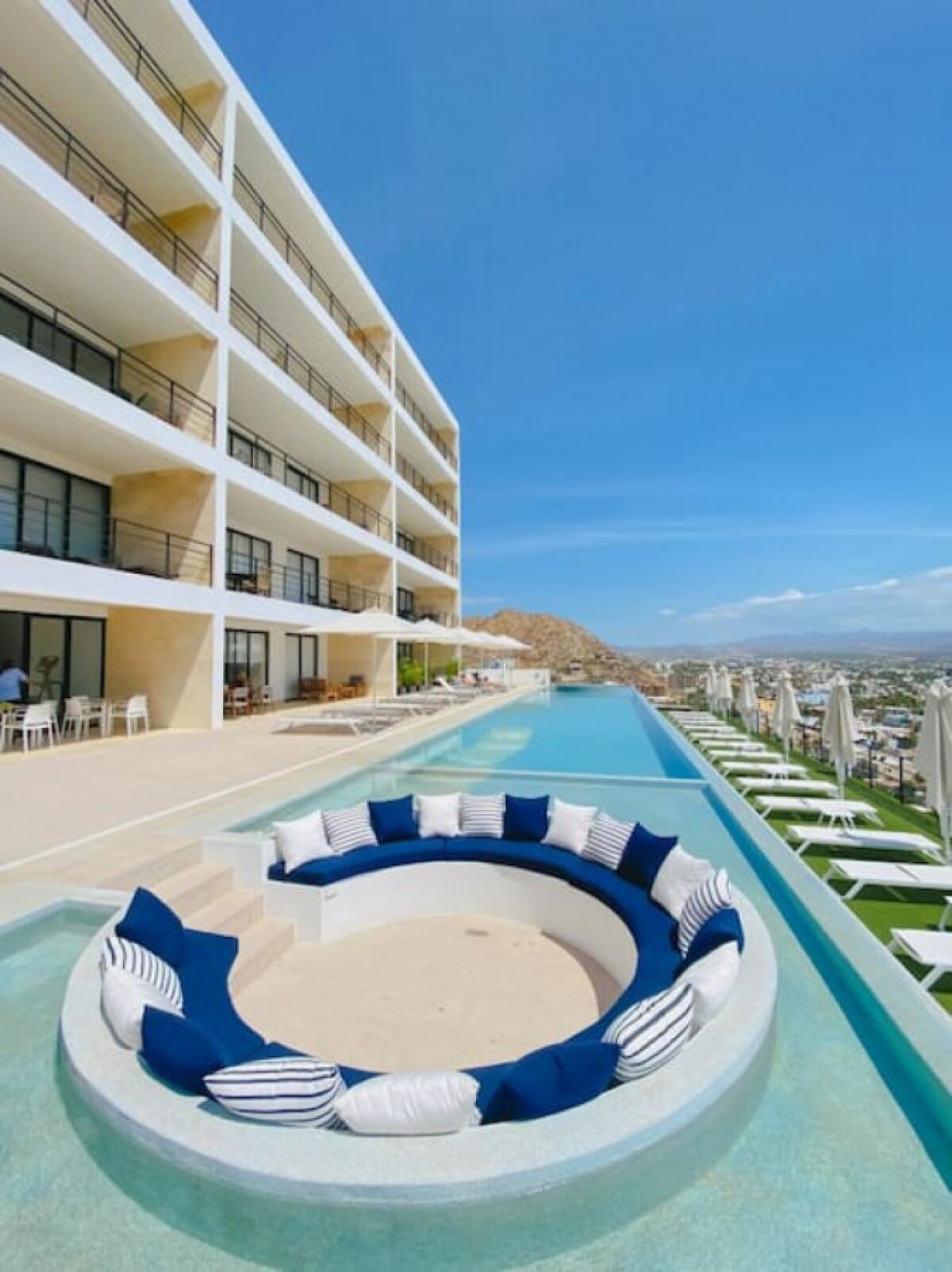 - Sweeping bay and Arch views from your private wraparound terrace: perfect for morning coffee or sunset cocktails. - Tennis courts, climate-controlled pool, and fully-equipped gym. - Two spacious bedrooms sleep 6 comfortably with a dedicated workspace, full kitchen, and in-unit washer/dryer. - Walk 5 min to Costco and Soriana for easy grocery runs or visit the marina restaurants and nightlife. - Reserve now for a serene retreat with all comforts and a welcoming host!