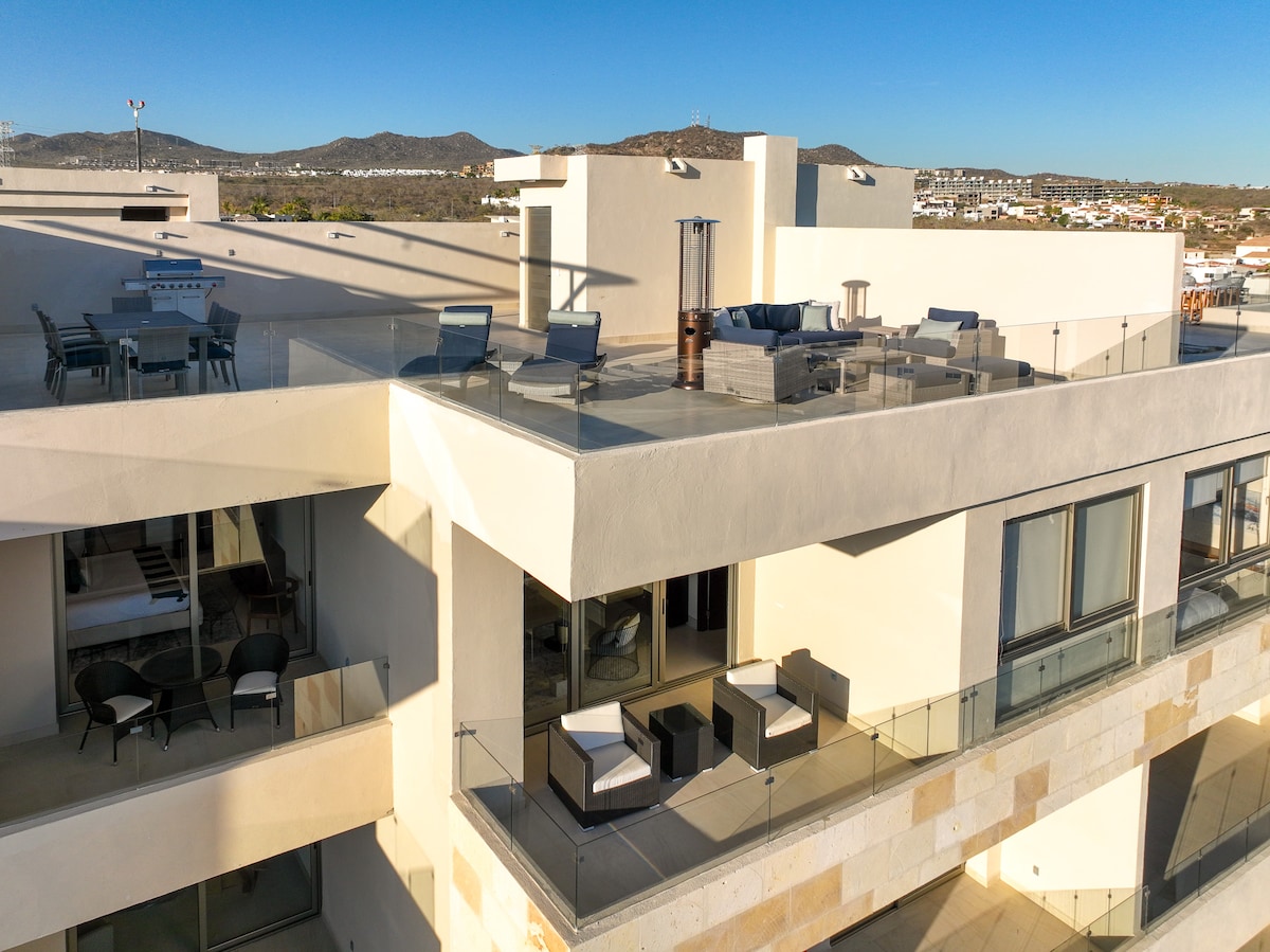 Welcome to your Cabo penthouse retreat - your rooftop escape for sunset soaks and relaxed coastal living! Perfect for groups looking to unwind above the city with space to gather and recharge: - Sleeps 10 | 4 bedrooms | 5 beds | 3.5 baths - 700 Sqft rooftop patio w/ hot tub, fire pit & outdoor kitchen - Outdoor pool, hot tub, sauna & shared gym in building - Ping pong table, pool table & TV - Kitchen, Wifi, free washer & dryer - In unit - Free parking, self check-in & beach essentials