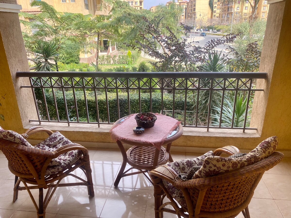 An ENTIRE APARTMENT with a back garden situated in a beautiful and green area in a peacefully integrated community fulfilling all residents' needs. Rooms are newly furnished, air conditioned, smart T.V. and all amenities you might need, super CLEAN and QUIET. The apartment is 25 minutes from Cairo intInternational Airport. coffee shops, restaurants, supermarkets, and pharmacies are all nearby. Hotel standard quality with home like comfort offered with a REASONABLE PRICED.