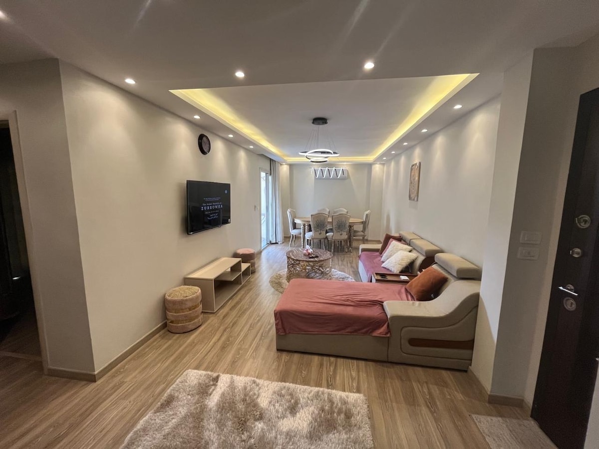Enjoy a stylish experience at this newly renovated apartment . Comfortable, open living area, fully equipped kitchen and a dedicated workspace with reliable Wi‑Fi. In unit laundry makes longer stays practical and stress free. The location is central, 15 minutes from Cairo International Airport, within a secure gated community yet close to business hubs, shopping, dining & cultural highlights. Major roads and public transport are nearby. Guest access is private and seamless with 24/7 security.