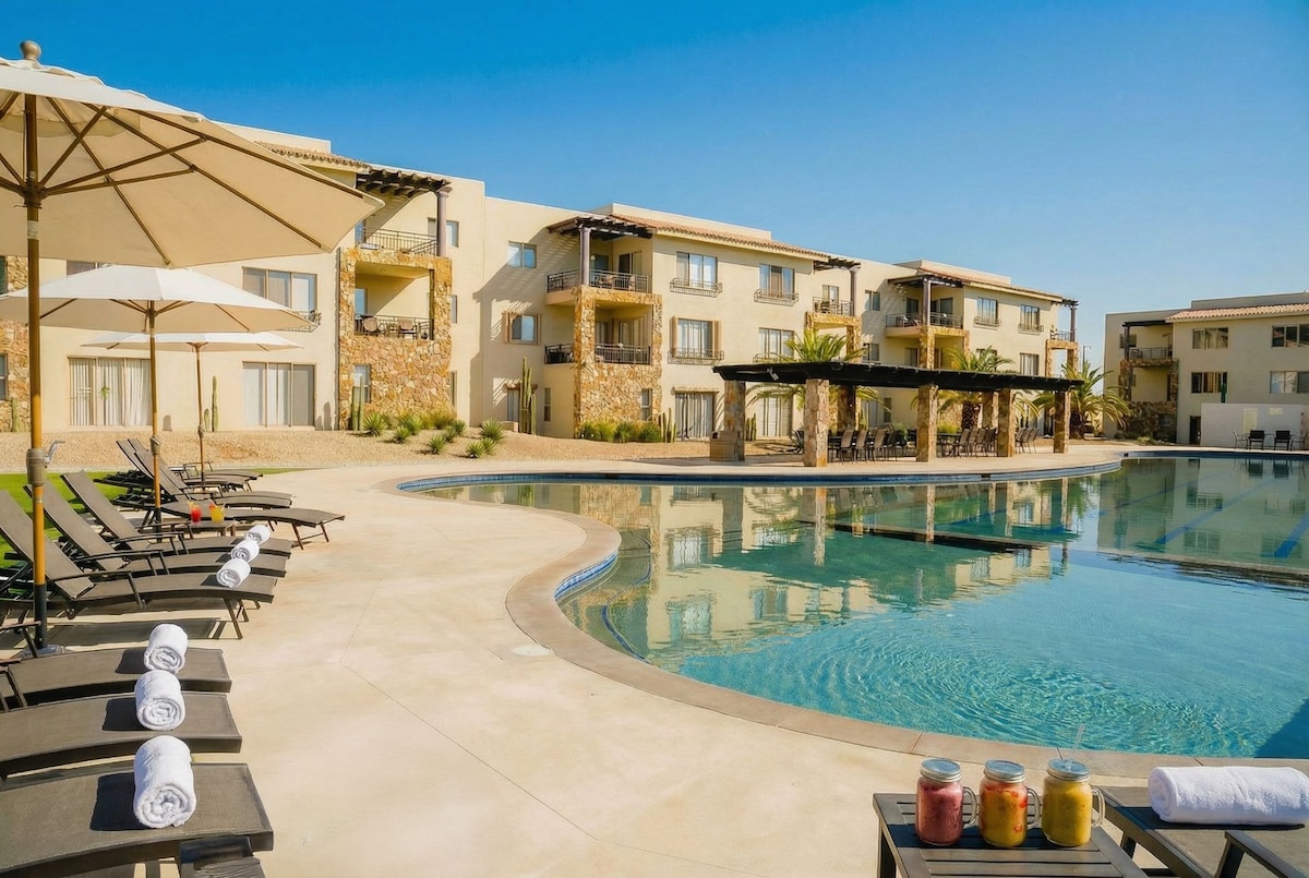 Bu müasir iki yataq otaqlı kondominium kiçik ailə və ya bir qrup dost ola biləcək 6 nəfərə qədər qonağı qarşılamağa hazırdır. İki geniş yataq otağı, tam funksional mətbəx və hər kəsin dincəlməsi üçün geniş yer təmin edən barbekü qaz qrili və qapalı məkanları olan olduqca qonaqpərvər açıq veranda. Bu gözəl kondominiumda Kabo San Lukas körfəzi və arxın heyrətamiz mənzərələri var.