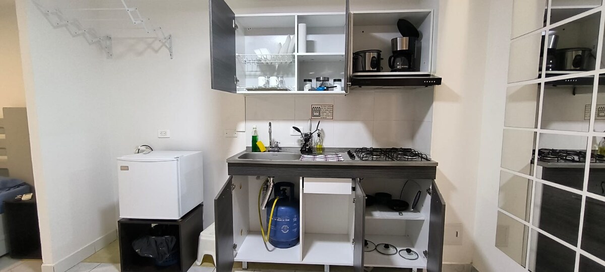 ¡Bienvenidos! Este acogedor apartaestudio moderno de 22 m2, es el lugar perfecto para quienes buscan confort y estilo en un solo espacio. Ubicado en uno de los mejores barrios familiares, en San Eduardo, ofrece fácil acceso a restaurantes, tiendas, hospitales y transporte. A 5 minutos del Aeropuerto, y de la Terminal de Transporte. - Totalmente amoblado: Cama, closet, mesa, plancha. - Cocina equipada: Con electrodomésticos modernos, minibar, cafetera, estufa, platos, sartenes, utensilios.