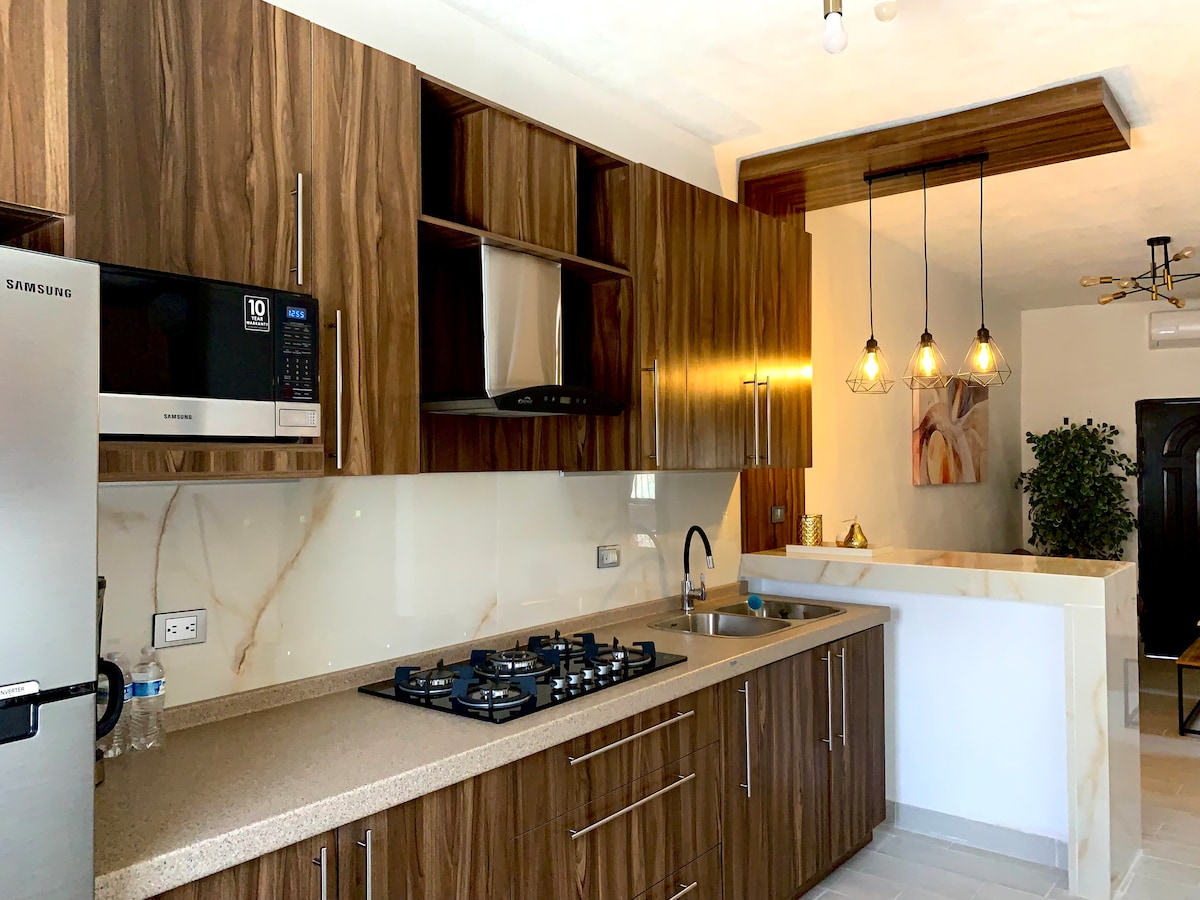 Cuatro departamentos nuevos con todas las comodidades, tres cajones de estacionamiento dentro y uno en la calle , a tres kms y medio de la playa y tres kms. de la unidad deportiva municipal, pescadería enseguida, mini super, tienda de coveniencia, frutería, tortilleria y gasolinera cerca.