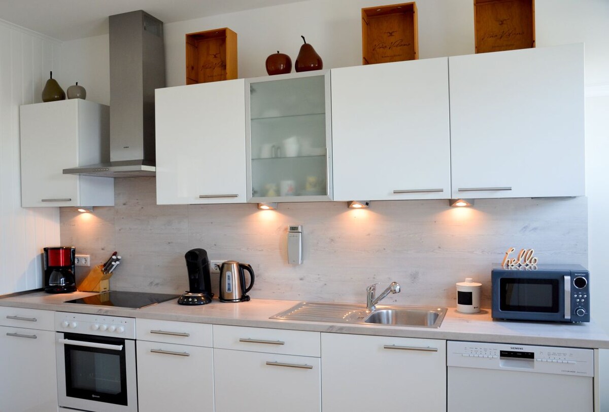 Öz bağı olan tətil mənzilimizə xoş gəlmisiniz. Mənzil yuxarı mərtəbədədir və paylaşılan pilləkən vasitəsilə əldə edilir. Queensize çarpayısı (1,4 x 2 m) olan qonaq/çarpayı-/iş otağı və iki çarpayısı olan başqa bir yataq otağı var. Duş/vanna və tam təchiz olunmuş mətbəxi olan vanna otağı. Ferma mağazası və restoran piyada məsafədədir. Ticarət obyektləri, turistik idman növləri və stansiyaya avtomobillə 5 dəqiqəyə çatmaq olar.