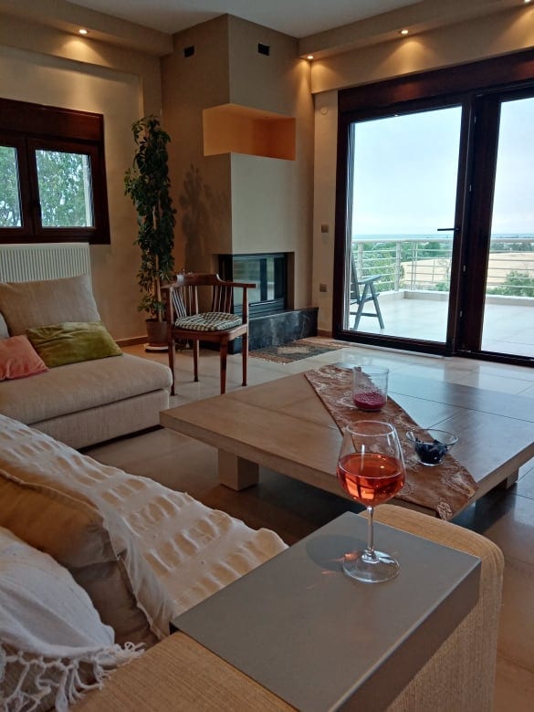 A beautiful, spacy, light rooftop apartment with views of the sea and mountain. 3 minutes from a blue star beach and a 5 star hotel. It has descent furniture, tableware, fast WIFI, TV channels from all over the world, HIFI system, air-conditioning, gas heathing, private parking, three balconies, elevator, intercom and a big walk-in closet. Close to Gerovassiliou (wine house), airport (15min), boat to the city centre in summer (45min). For a small fee we can pick you up from the airport.