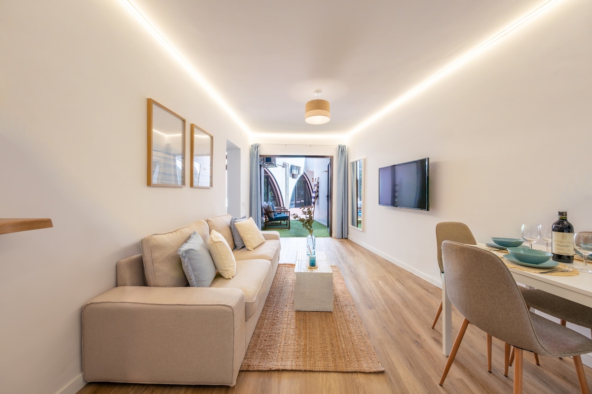 Bir yataq otağı, tam təchiz olunmuş mətbəxi və gözəl balkonu ( hovuz mənzərəsi) olan gözəl, müasir təmirli mənzil. İki sakit kondisioner Pulsuz yüksək sürətli lifli Wi-Fi və yaxşı iş yeri. Paltaryuyan maşın. Gözəl Maspalomas çimərliyinə 500 metr məsafədə, küçə boyunca, böyük supermarket və Yumbo mərkəzinə yaxın super (ayaqla 5 dəq). Paltarla və ya paltarsız istirahət edə və günəş vannası qəbul edə biləcəyiniz gözəl dam terrası (Dağ və dəniz mənzərəsi) (Lift sizi asanlıqla ayağa qaldırır)