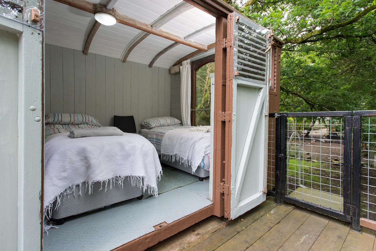 Award-winning beautifully converted Victorian railway carriage. Mevy is sumptuous, with gilded maple and mahogany panels, velvet upholstery and a roll top bath. Family and allergen friendly, we can provide a cot and high chair on request. Mevy sleeps five, but two bunks are only 5'7" so only for smaller people. Lovely view over rolling hills. Mevy has all mod cons but is very eco friendly - Railholiday have won numerous national and local awards for our green approach . Sorry, no pets in Mevy.