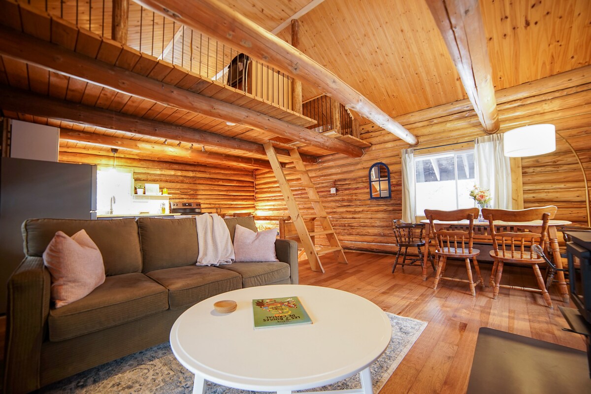 Le loup, grand chalet de 3 chambres à coucher pouvant accueillir jusqu'à 8 personnes. Construit en 2023. Cuisine et salle à manger spacieuse et lumineuse, très bien équipée. Wifi, tv intelligente, grande terrasse avec BBQ, foyer extérieur (bois, papier et allumettes non inclus), air climatisé et spa. L'emplacement en forêt assure la tranquillité. Vous pouvez profiter de plusieurs activités en plein air de la région.