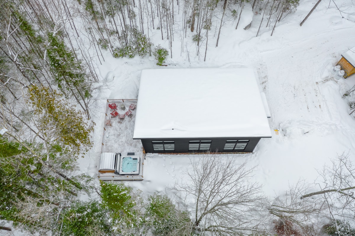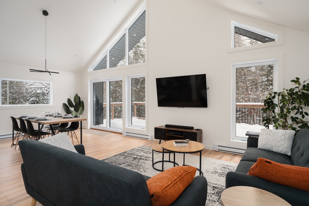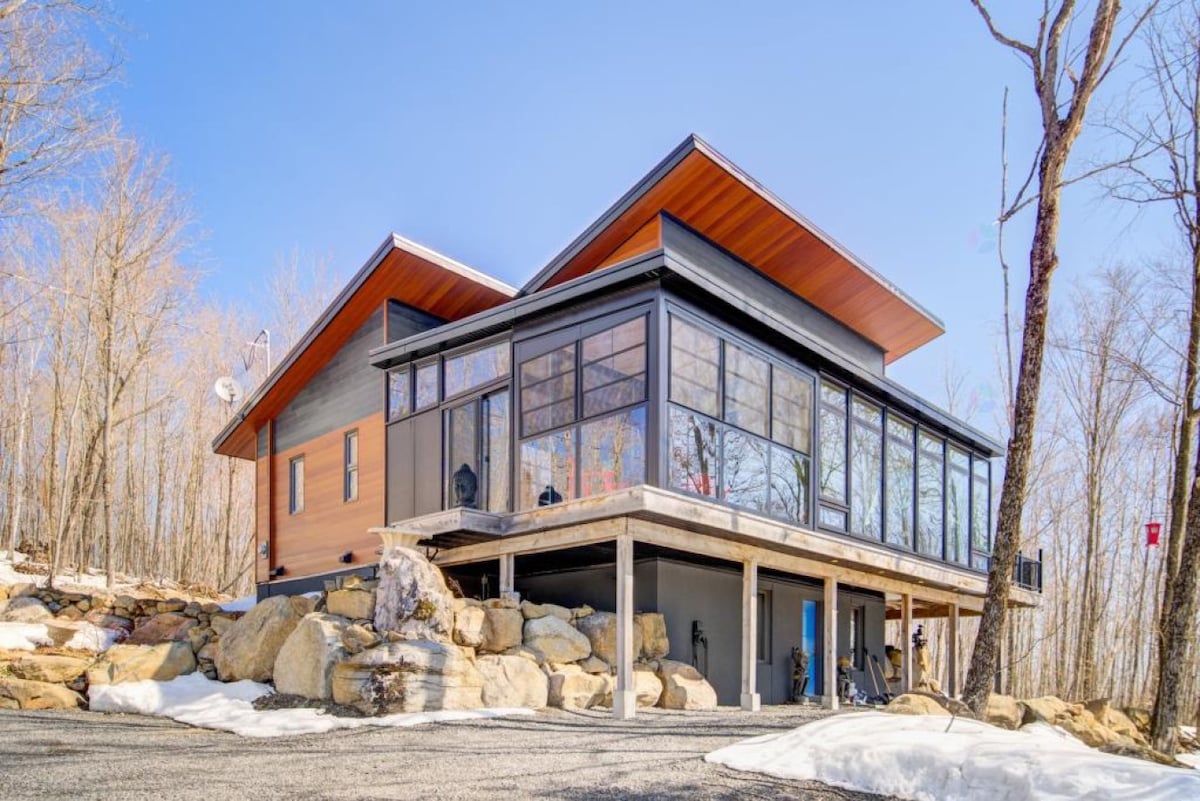 Our Nordic forest chalet is perfect for spending quality time as a couple (or with a kid), or for a work-retreat (with high-speed WiFi). The wooden interior is warm and cozy. The full-height windows offer stunning views over a forested valley. The open-concept kitchen and living room keep you in the conversation while cooking. If you prefer to cook outside, there is a fire pit with a grill and outdoor dining table. Only 70-min drive from Montreal. The lake is a 25-min walk if you park nearby.