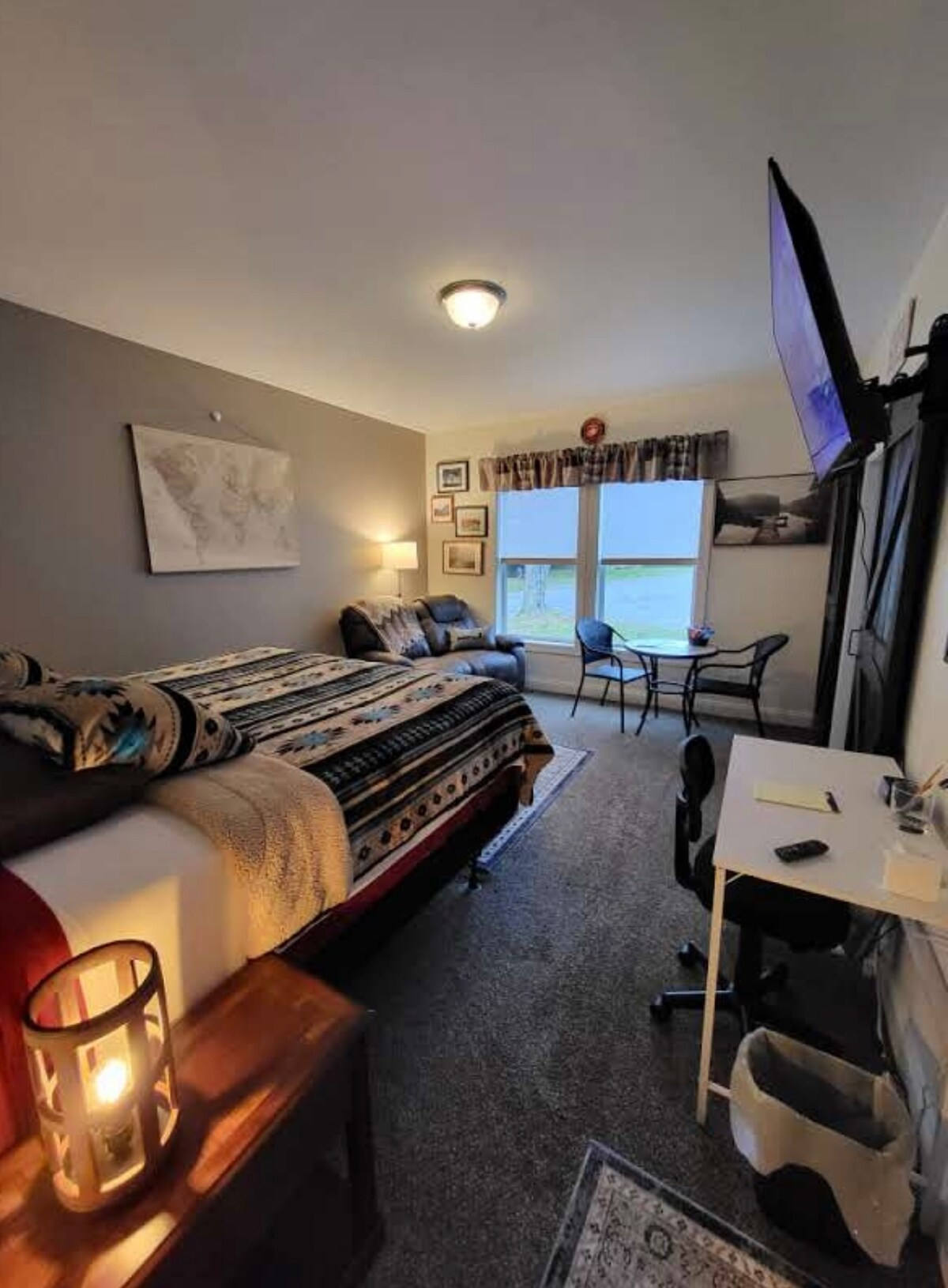 Bu unikal və sakit tətildə özünüzü asan hiss edin. Bir və ya iki böyük üçün mükəmməldir. Hava feni/toster sobası, mikrodalğalı soba və keurig ilə rahat çarpayı, ayrıca hamam, balaca mətbəx (mətbəx deyil). Küydən və səs-küydən uzaqlaşın və bu sevimli ayrıca nömrədə təbiətə daha yaxın qalın. Döşəkağılar, dəsmallar və çoxsaylı mətbəx əşyaları təmin edilir. Ətraf şəhər və kəndlərdə çoxlu populyar fəaliyyətlər və mənzərələr. Pulsuz Wİ-Fİ mövcuddur, lakin etibarsız ola bilər.