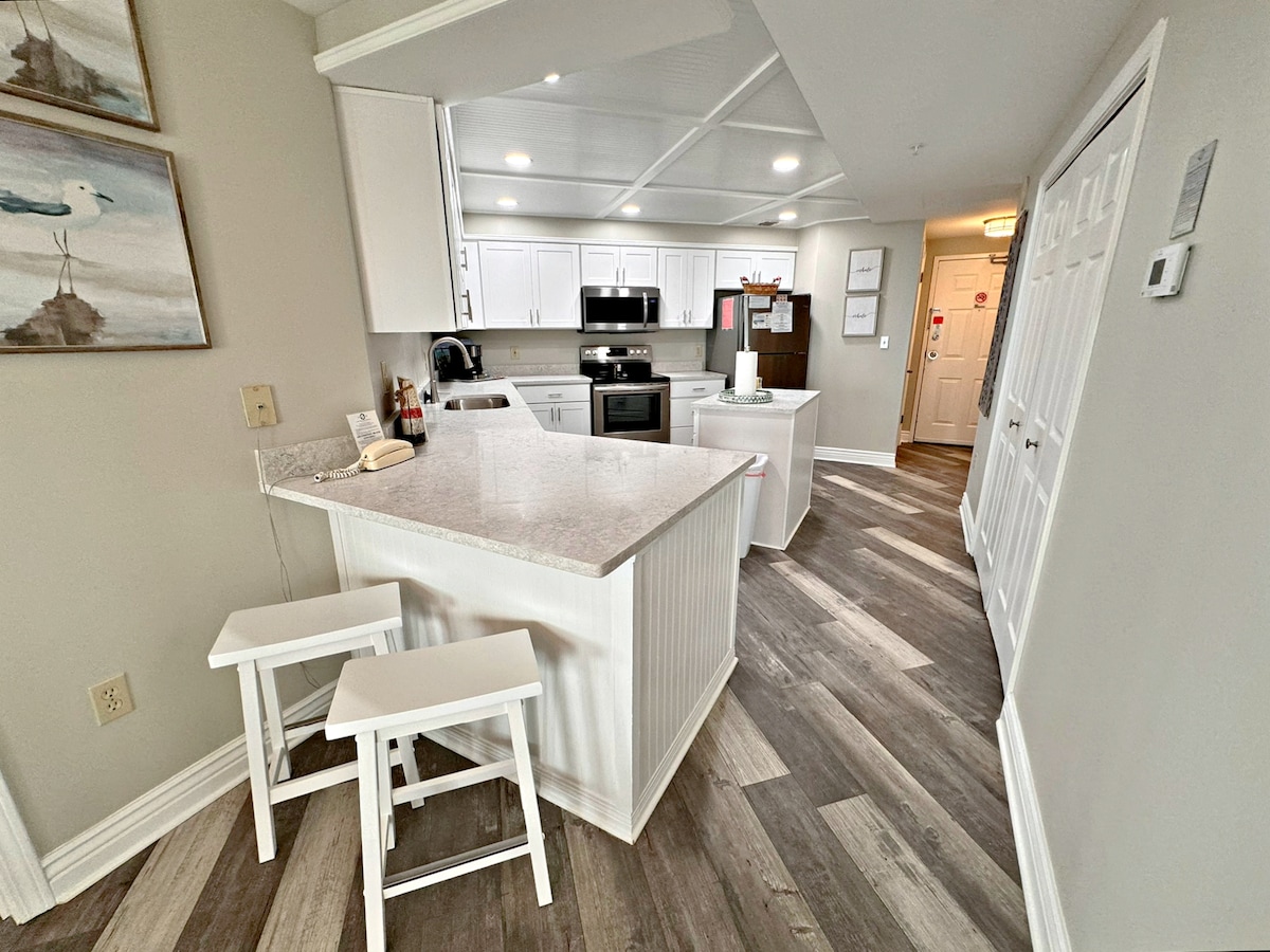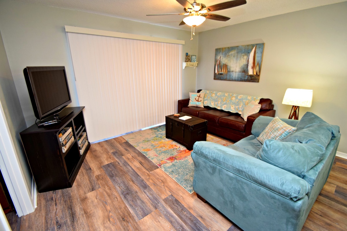 The Wharf-da bu gözəl və bütün yeni yenilənmiş kondominiumda bütün ailə ilə əylənin! 8 nəfərə qədər (1 kral, 2 kraliça və 1 kraliça divan çarpayısı), qaraj parkinqi, qazla əlaqəli manqallı balkon, çimərlik çətiri, çimərlik kresloları, paket-n-pley, uşaq boşqabları, fincan, qab-qacaq, paltaryuyan/quruducu, buz maşını, şərab soyuducusu, qəhvə qazanı VƏ kueriq! 8 nəfərlik mətbəx oturacağı olan gözəl sakit mənzil yeniləndi! Şampunlar, sabunlar, kağız məhsulları və zibil torbaları! Ən yaxşı masa və kart oyunları! Hər otaqda ağıllı televizorlar!