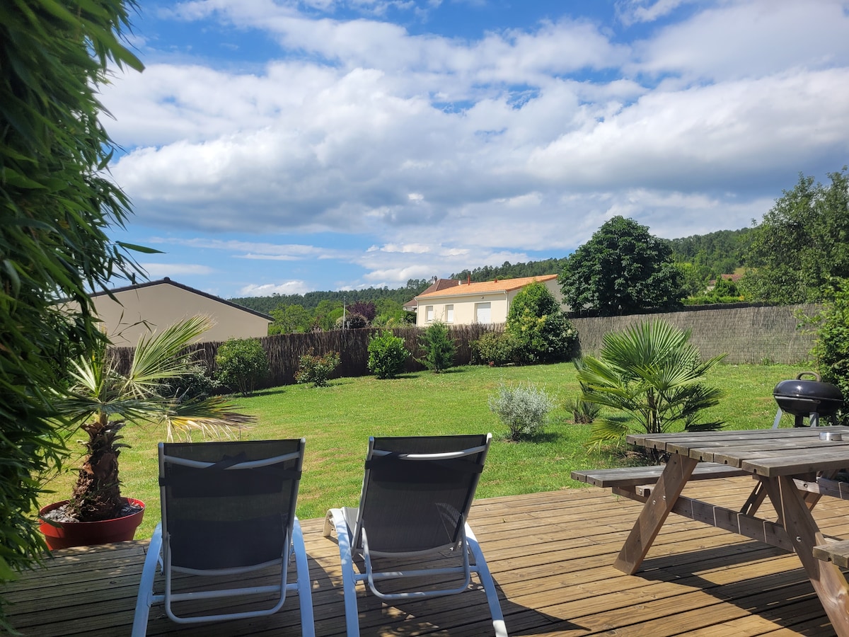 Cette maison allie élégance et fonctionnalité. Avec une cuisine équipée, son salon cosy doté d'une TV ( avec Netflix) , et donnant sur une terrasse en bois avec vue sur le vallon, le cadre est idéal pour détente et gastronomie. La chambre, équipée d'un lit 160x200 et d'une TV (avec Molotov). Conçue pour satisfaire tous les besoins, cette maison combine confort moderne et charme pour des vacances parfaites. Possibilité de garer la voiture devant la maison, dans l’allée privée