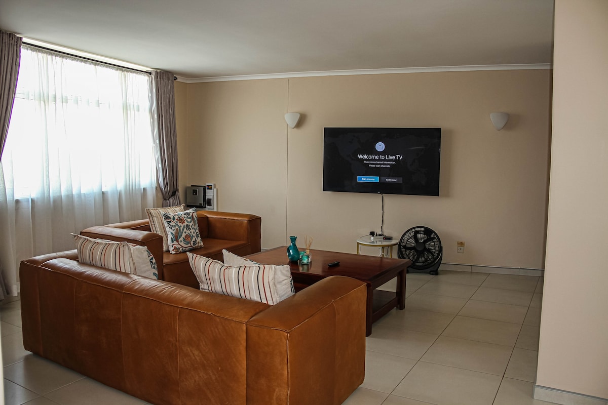 Kick back and relax in this calm, stylish space in a secure complex. It is the perfect retreat for families, friends or business travelers. Enjoy the comfort of luxurious linen and air-conditioned bedrooms as well as entertainment on the 80-inch smart TV that boasts DSTV, Netflix & unlimited WiFi. You’ll be greeted by modern furnishings, a fully equipped kitchen & clean bathrooms. Located just a stones throw from Ascot Shopping center & only 3km from the city center, it is conveniently situated.