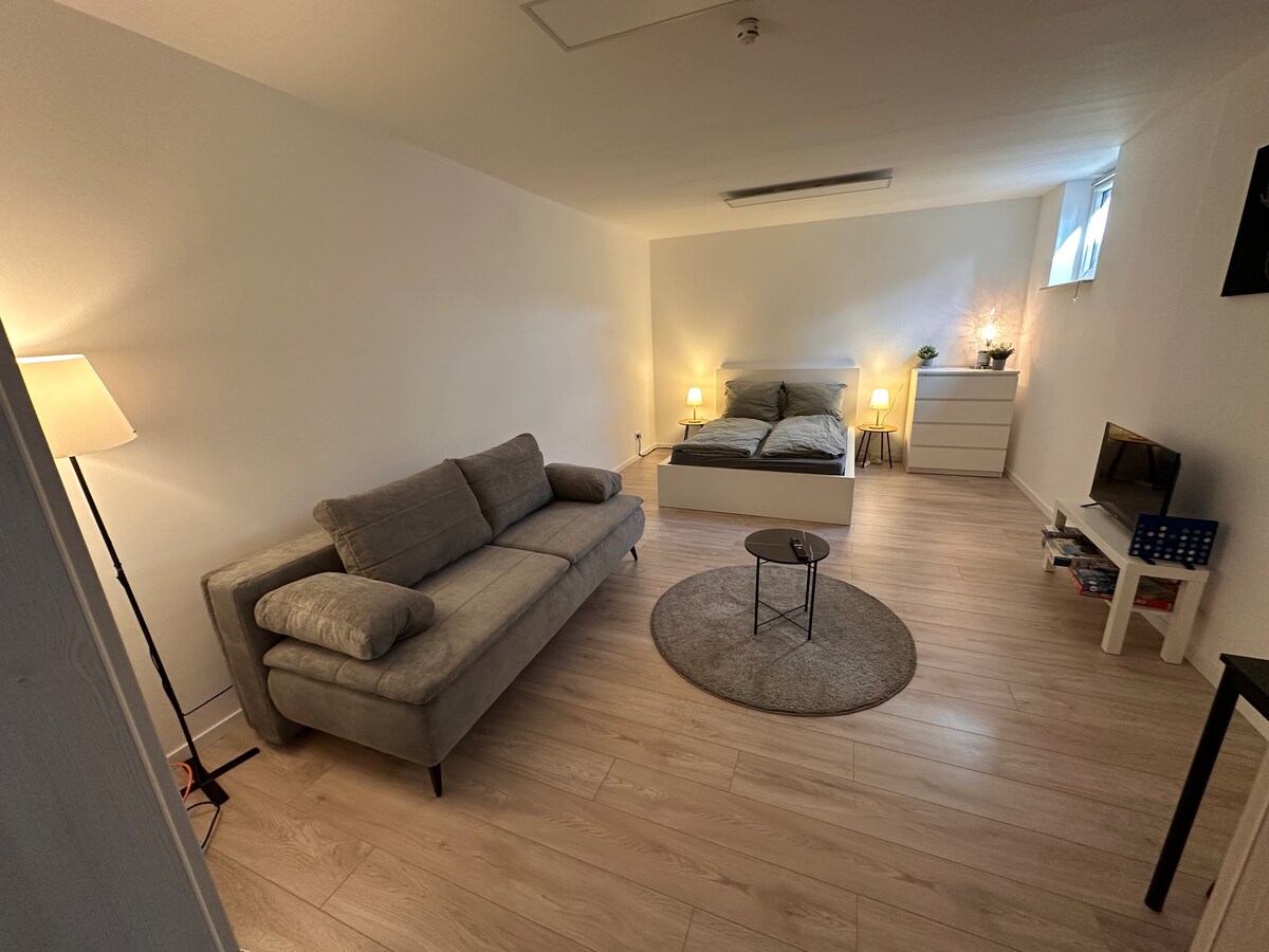Das 2021 erbaute Haus liegt im Herzen von Oberhausen. Die ruhige ca. 35m2 große Wohnung befindet sich im Kellergeschoss und hat einen separaten Eingang. Sie verfügt über ein Schlaf/Wohnzimmer sowie über ein Tageslichtbad und eine Küche mit Indunktionskochplatte sowie einen Kühlschrank und einem Mikrowellen Backofen Kombigerät. Das Aufladen von Elektrofahrzeugen kann nach vorheriger Absprache erfolgen.