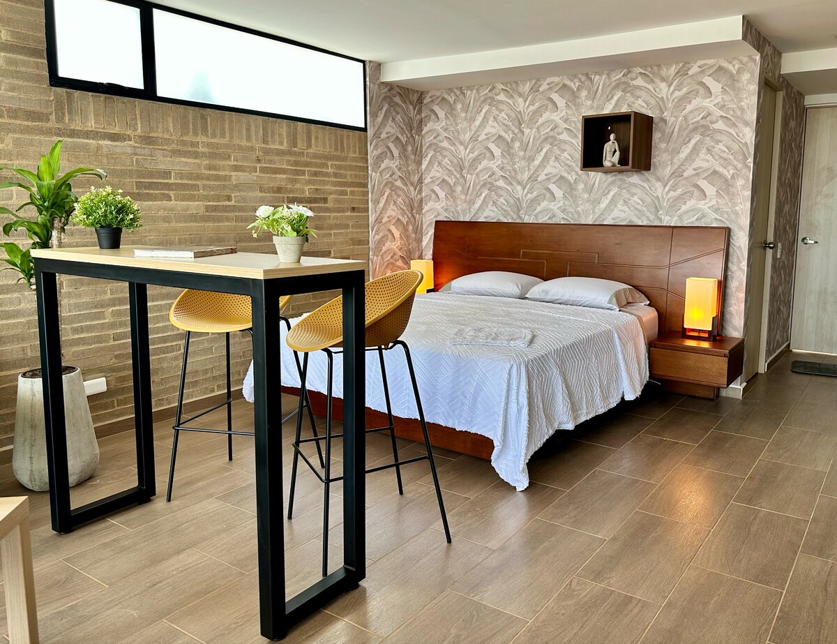 ** AIRBNB XİDMƏT HAQLARI OLMAYAN EKSKLÜZİV VAHİD ** Sakit Kristales de Kali məhəlləsində yerləşən bu müasir 42m ² loft və maksimum 3 nəfər üçün mükəmməl olan Kalinin heyrətamiz mənzərəsi sizin rahatlığınız üçün tam təchiz olunub. Binada iş yeri, trenajor zalı, cakuzi, piknik sahəsi, açıq havada kinoteatr və s. kimi imkanlar var. Parque del Perro, medika və idman zonasından cəmi bir neçə dəqiqə məsafədə qonaqlamanızı mükəmməl edir.