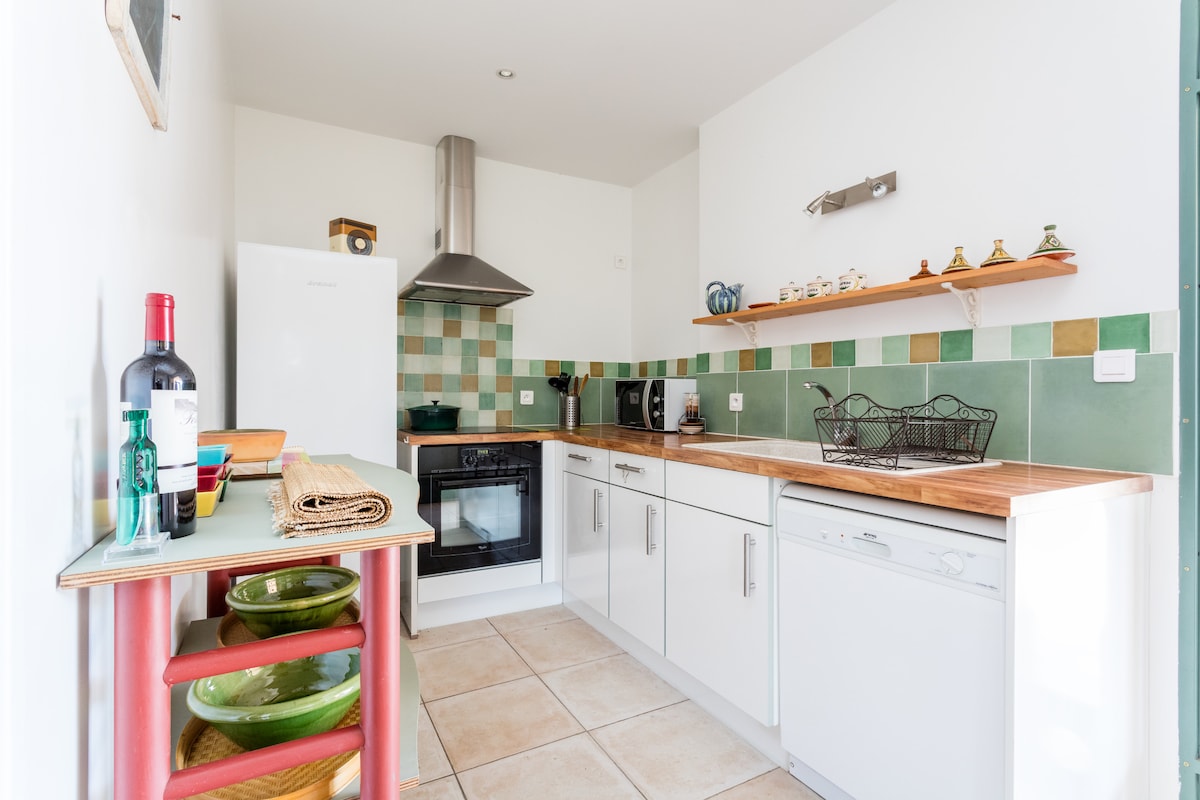 Dépendance 27m2 , facon suite parentale à côté de notre villa. piscine en partage avec la maison. Entree privee pas de mur mitoyen avec la villa Une terrasse avec table sous la pergola vous est réservée. linge de lit mis à votre disposition . Ce n’est pas un studio, donc il n y a pas de vraie cuisine ni evier. Cependant l’espace au fond est équipé d’un frigo/ congelateur, micro onde , machine à café, grille pain, vaisselle. Sucre, thé, capsules café à disposition.