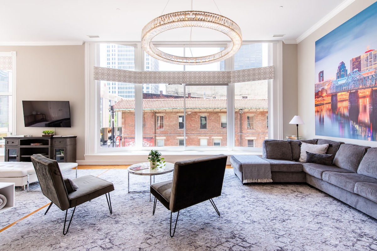 ***Derby Week/Weekend requires a 3-night minimum.*** Ideal for conference guests, concert weekends, and bourbon tourists. Enjoy incredible views from this 8th-floor corner loft in a beautifully restored historic downtown building. With 1,200 sq ft of open space, you’re steps from the Kentucky Int'l Conv Center and the Urban Bourbon Trail, plus dining, nightlife, museums, Waterfront Park, Churchill Downs, medical centers, and the airport. Sleeps up to 6 with 3rd queen bed set up upon request.