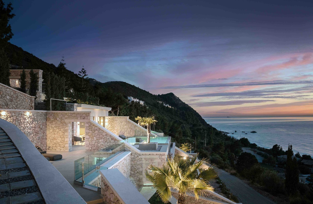Heavenly Heights Villas is an exclusive three-villa retreat in the picturesque village of Evgiros, Lefkada, where dramatic mountain landscapes meet the endless blue of the Ionian Sea.Designed to host up to five guests, each villa offers an exquisite blend of elegance and comfort, making it the perfect sanctuary for families or groups seeking a refined escape.Expansive private outdoor spaces and individual pools invite guests to unwind in absolute seclusion, enveloped by the raw beauty of nature.