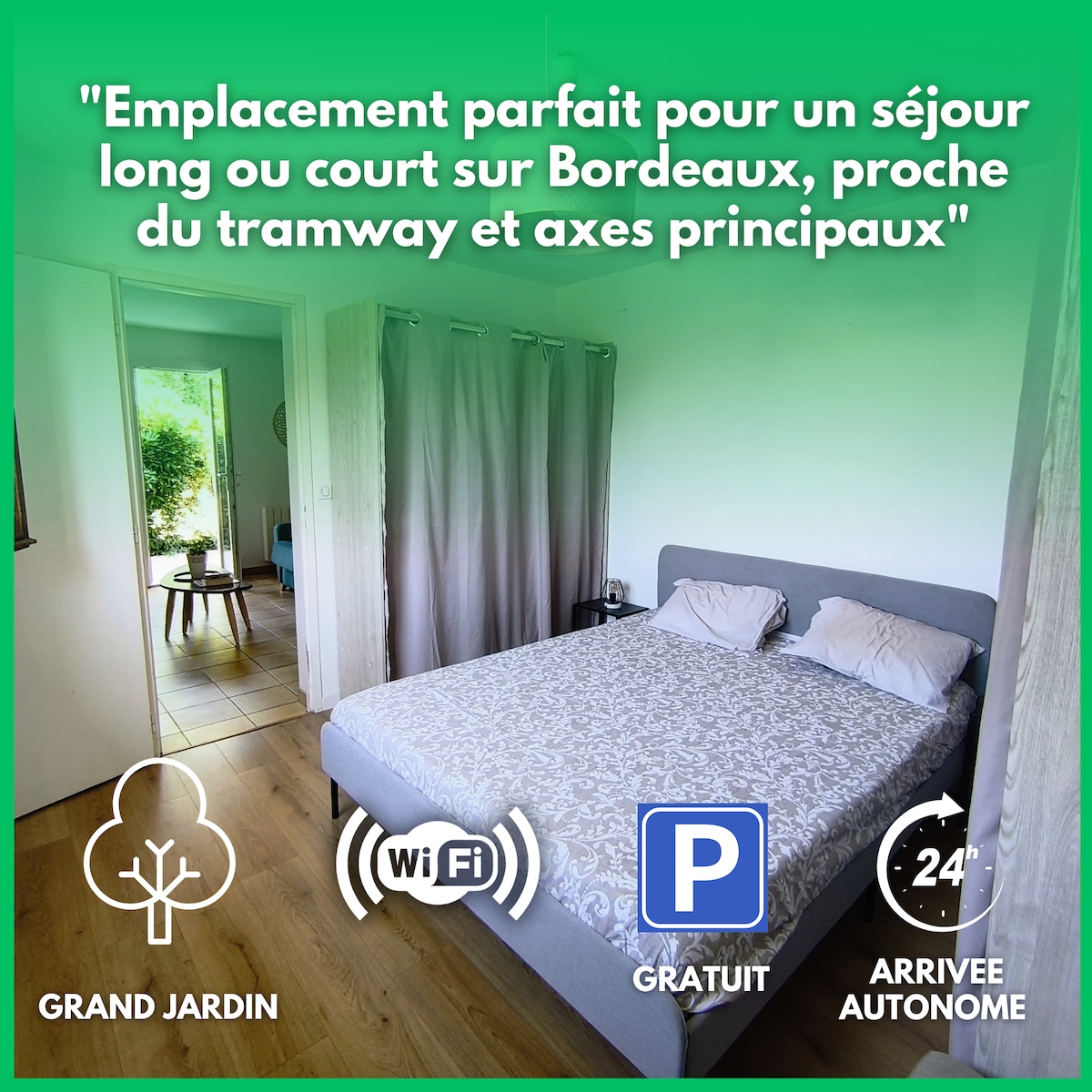 Bordeaux Saint Augustin charmant et chaleureux studio pour 2 personnes, entièrement indépendant, avec accès individuel et agréable petit jardin privatif, arboré . Idéalement situé, à proximité des cliniques Saint Augustin (50m), Bel Air (250m) et Hôpital Pellegrin (800m). A 7 minutes en bus de Bordeaux centre (arrêt de bus à 50m du studio). A 30 minutes de l'Aéroport de Mérignac en tram (ligne directe) et à 30 minutes de la gare Saint Jean (ligne 9) Le stationnement est gratuit dans la rue