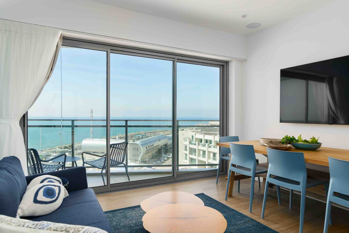 Newly redesigned & fully remodeled stunning 1 bedroom &balcony apartment, accommodates up to 4, direct & ocean view, fully equipped kitchen, 65" +50"4K HD smart TVs, free WiFi, free parking, 24/7 reception/security at Okeanos at the marina building, adjacent to Hertzeliya's beautiful beaches, minutes from Tel Aviv. Perfectly situated few min walk to restaurants & shops at the marina, less than 5 minutes from Hertzeliya's Silicon Valley, 30-40 min to Caesarea golf course, 45-55 to Jerusalem.