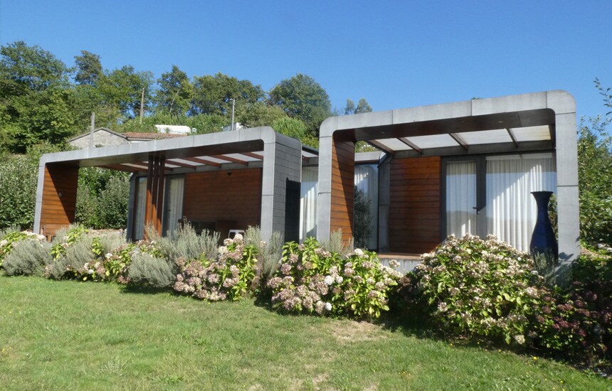 Ətraf mühitə amplitud bəxş edən panoramik pəncərələrlə təbii işığın və heyrətamiz mənzərələrin girişinə imkan verir. Burada qonaq otağı, tam təchiz olunmuş yemək sahəsi, geniş və duş kabinəsi olan müstəqil yataq otağı, yataq otağında hamam otağı və açıq hava platformasında cakuzi SPA var. Dağda və üzüm bağları və meşələrlə əhatə olunmuş villalar Monte dos Xistos Quimarães şəhərinin tarixi mərkəzindən 10 km məsafədə yerləşən mövqedən zövq alın