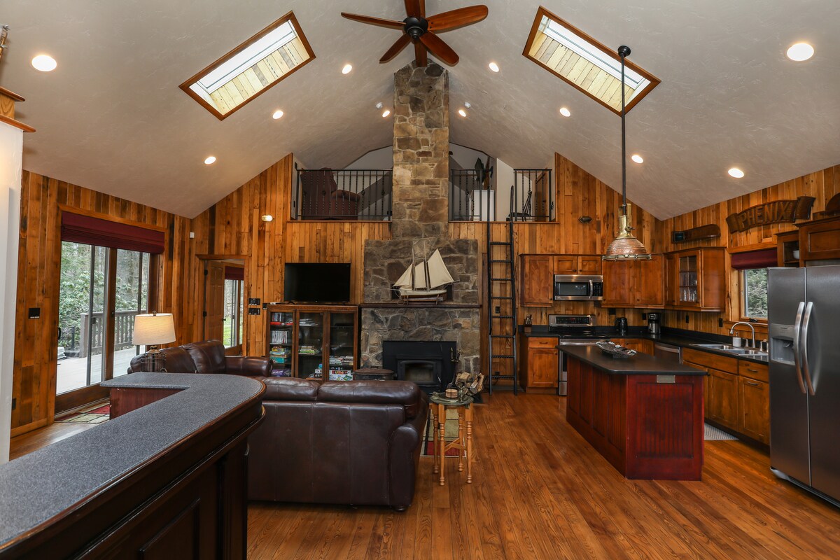 The primary bedroom features a queen-size bed, while the secondary bedroom includes a full-size bed. The living area is equipped with a sleeper sofa for extra sleeping space, and the loft adds two twin mattresses for additional accommodations, ideal for kids. The cabin’s kitchen is equipped with everything you need, including an oven and refrigerator and microwave. Whether you're enjoying time indoors or exploring the outdoors, this cabin offers the perfect balance of comfort and adventure.