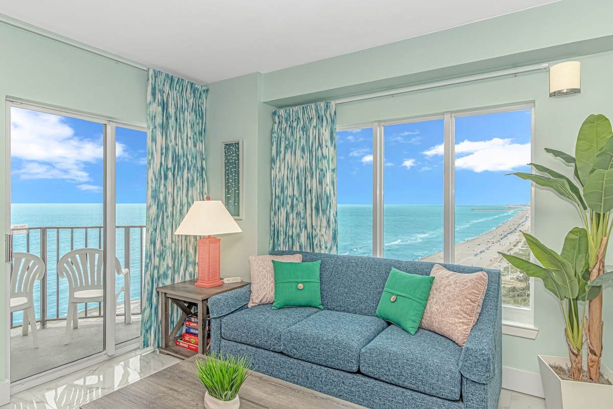 Şəxsi balkonunuzdan Atlantik okeanının və daxili ərazilərin nəfəs kəsən mənzərələrini və gün batımını seyr edin. Müasir sahilyanı dekor, Smart TV və rahat çarpayılarla tam təmir olunub. Çimərliyə, taxta döşəməli piyada yoluna və SkyWheel-ə gedən pilləkənlər. Sakit çayların, hovuzların, cakuzi, tiki bar və yerində Starbucks-ın zövqünü çıxarın. Mörtl-Biçin mərkəzində mükəmməl romantik və ya kiçik ailə tətili! Pulsuz parkinq və Wi-Fi. İndi bron edin!
