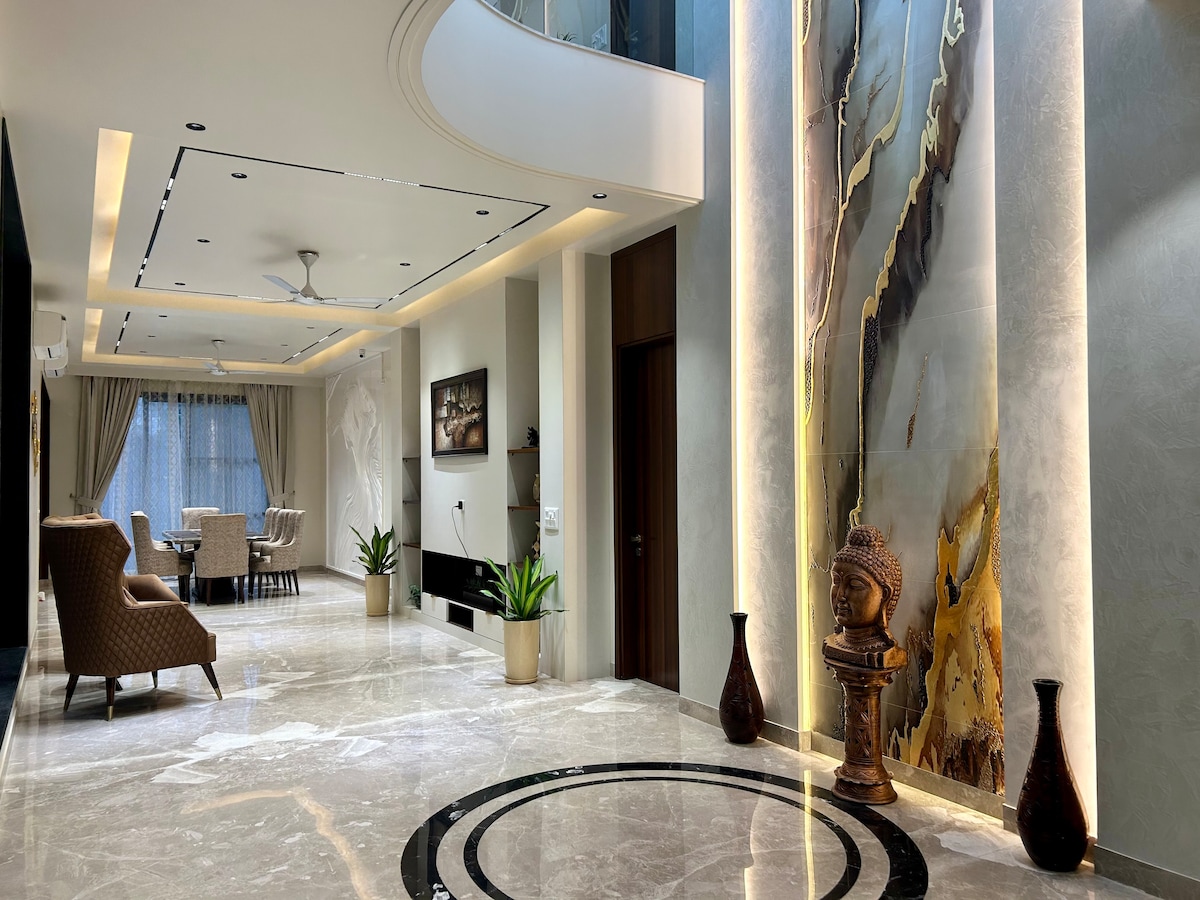 A rare lavish Gurgaon Airbnb with 3 bedrooms, 3 en suite bathrooms, a spacious living room, a dining area, and a functional kitchen. Nothing less than luxurious, state-of-the-art amenities, perfect for long term stays or get togethers. The large, inviting rooms blend elegance with functionality, ensuring a memorable stay in the heart of Gurgaon. No Loud Parties permitted here. For Commercial shoots, there are extra charges applicable.