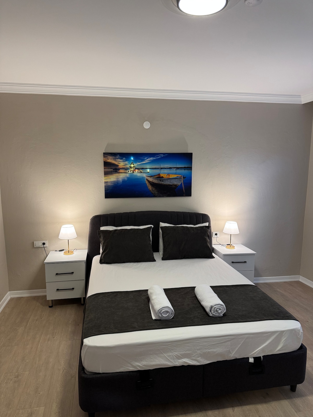Çimərlikdən və şəhər mərkəzindən 5 dəqiqəlik məsafədədir. Hava limanına maşınla 25 dəqiqədir. Bazar, restoran və kafelərə piyada məsafədədir. Binanın qarşısında mikroavtobus dayanacağı var. Girişdə geyim mağazası və müştərilər üçün pulsuz parkinq yeri də var. Müasir mebel və tam təchiz olunmuş mebel. Hər bir otaqda kondisioner və ağcaqanad torları var. Bütün otaqlarda istilik sistemi və 24 saat isti su var. Otaqlar geniş və genişdir. Bütün mətbəx ləvazimatları mövcuddur. Mənzildəki bütün elementlər yenidir