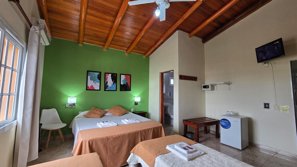 İmtiyazlı mövqe (termal hamamlardan 3 blok və şəhərin mərkəzində mikros terminaldan 2 blok). Tam təchiz olunmuş monoen Environmental (soyuducu, anafe, oyun meydançası, qəhvə maşını, blender, toster, mətbəx ləvazimatları və krujeva, fen), həmçinin bölünmüş soyuq/istilik və ultra səssiz tavan ventilyatoru ilə. hovuzu və açıq havada ümumi məkanları olan gözəl bağda ehtiyacınız olan hər şeyin olduğu manqal sahəsi də var. Əlavə ödənişlə à la carte səhər yeməyimiz də var.