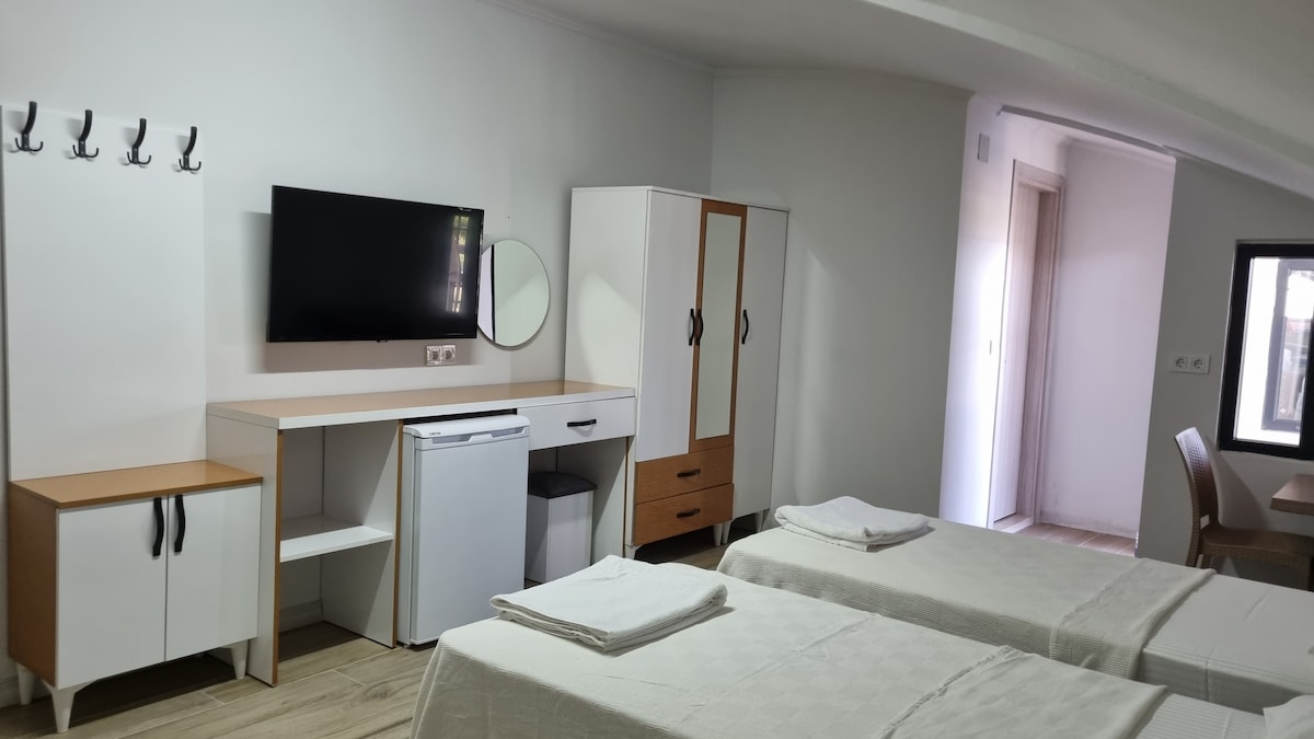 Bu sakin, şık mekânda arkanıza yaslanın ve rahatlayın. Odamız 2 kişilik tasarlanmış olup bir oda ve bir banyo/WC/Duştan oluşmaktadır. Oda çatı katında bulunmaktadır. Klima, mini buzdolabı, elbise dolabı ve 2 tekli yataktan oluşmaktadır. Odada mutfak yoktur. Çalış plajına 400mt mesafededir. Yetişkin ve çocuk havuzu bulunmaktadır. 7/24 personel desteği vardır.