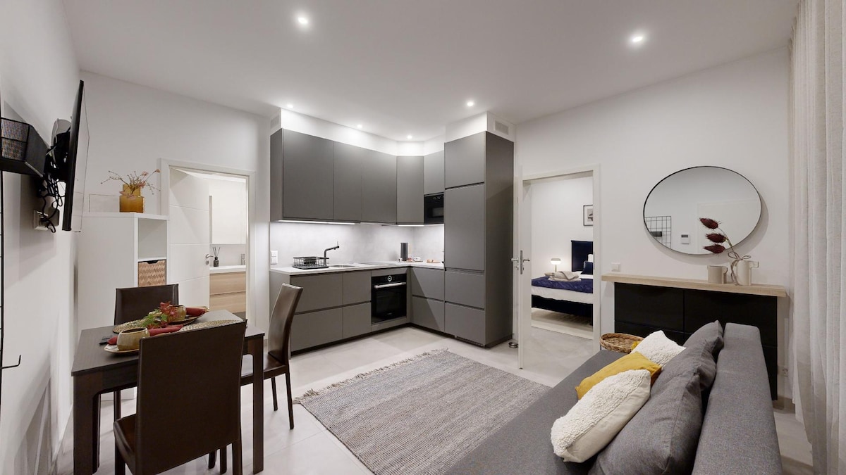 This modern apartment features a cozy double bed, a comfortable sofa, and a TV for relaxing evenings. The fully equipped kitchen includes a fridge, coffee machine, kettle, and everything needed to prepare meals. Enjoy the fresh air and city life from the balcony. Conveniently located above a supermarket and next to a bus stop, with bus lines 18, 24, 76, CN8 night bus, and more. Nearby, you'll find coffee shops, restaurants, and all essential amenities for a perfect stay.