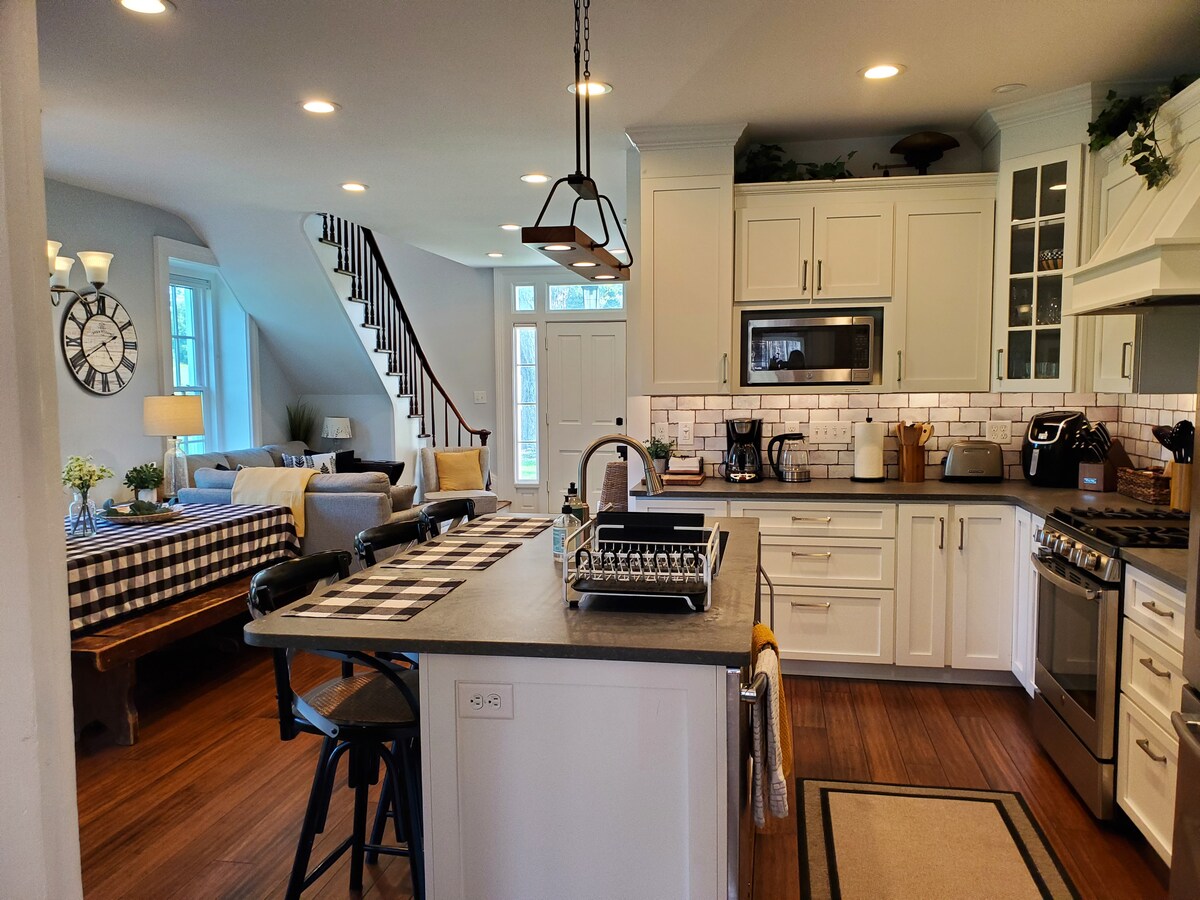Experience luxury at Barn Manor, a converted barn surrounded by fields and forests. Relax in a jetted tub with heated floors, enjoy fireside evenings, and admire custom woodwork, marble accents, indoor hammock and unique windows. Both levels are open floor plans: the first floor has a queen bed, full kitchen, living space, and bathroom; upstairs offers a king bed with Casper mattress, queen futon, and optional fold-out twin. Sleeps up to 8. Ask about long-term winter stays.
