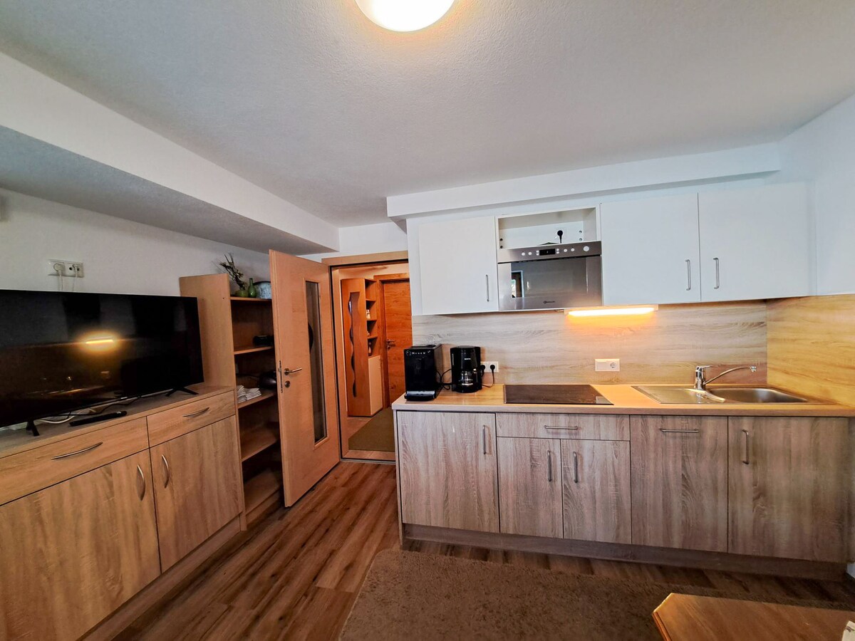 All discounts are already included, please go ahead and book the property if your travel dates are available. Below please see all the listing details "Alpina", 2-room granny flat 35 m2. Beautiful and cosy furnishings: 1 double bedroom with satellite TV. Exit to the terrace. Small kitchen (4 ceramic glass hob hotplates, toaster, kettle). Bath/WC. Heating. Small terrace 5 m2. Terrace furniture. Beautiful view of the mountains. Facilities: Internet (WiFi, free). Parking.